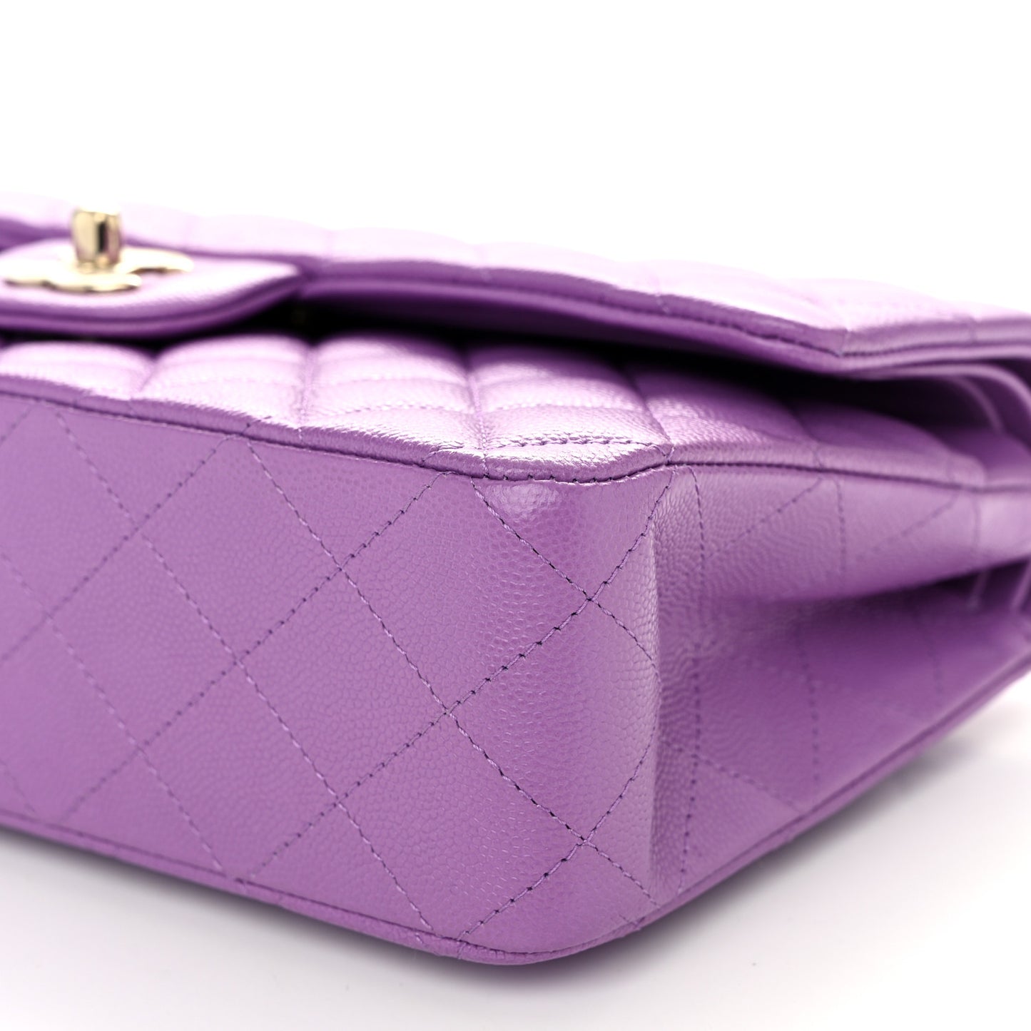 This is an authentic CHANEL Caviar Quilted Medium Double Flap in Purple. This stunning shoulder bag is crafted of luxurious diamond quilted grained calfskin leather in purple. The bag features a gold chain shoulder strap threaded with leather and a front flap with a gold Chanel CC turn-lock closure. This opens to reveal an inner flap and a matching purple leather interior with patch pockets.Follow this item for alerts. Chanel is a registered trademark of Chanel. FASHIONPHILE is not affiliated with Chanel.