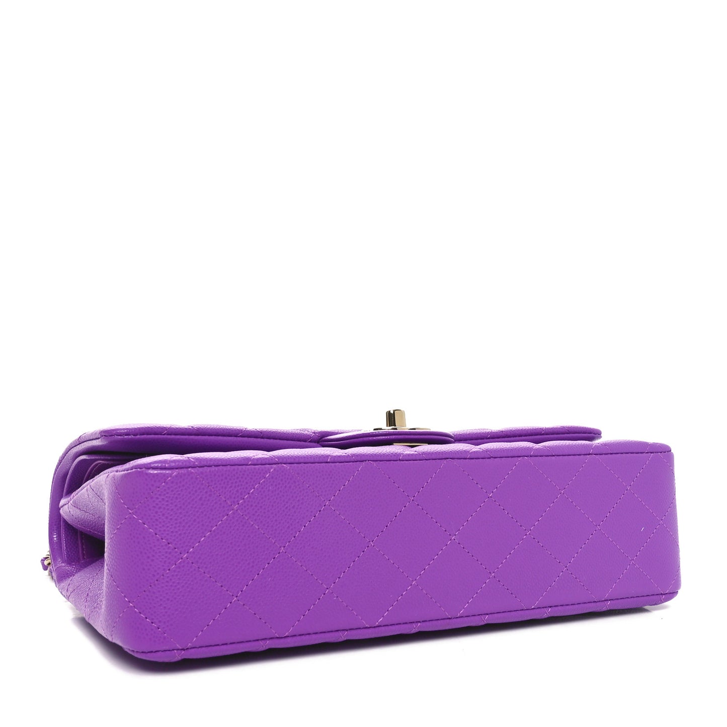 This is an authentic CHANEL Caviar Quilted Medium Double Flap in Purple. This stunning shoulder bag is crafted of luxurious diamond quilted grained calfskin leather in purple. The bag features a gold chain shoulder strap threaded with leather and a front flap with a polished gold Chanel CC turn-lock closure. This opens to reveal an inner flap and a matching purple leather interior with patch pockets.Follow this item for alerts. Chanel is a registered trademark of Chanel. FASHIONPHILE is not affiliated with Chanel.