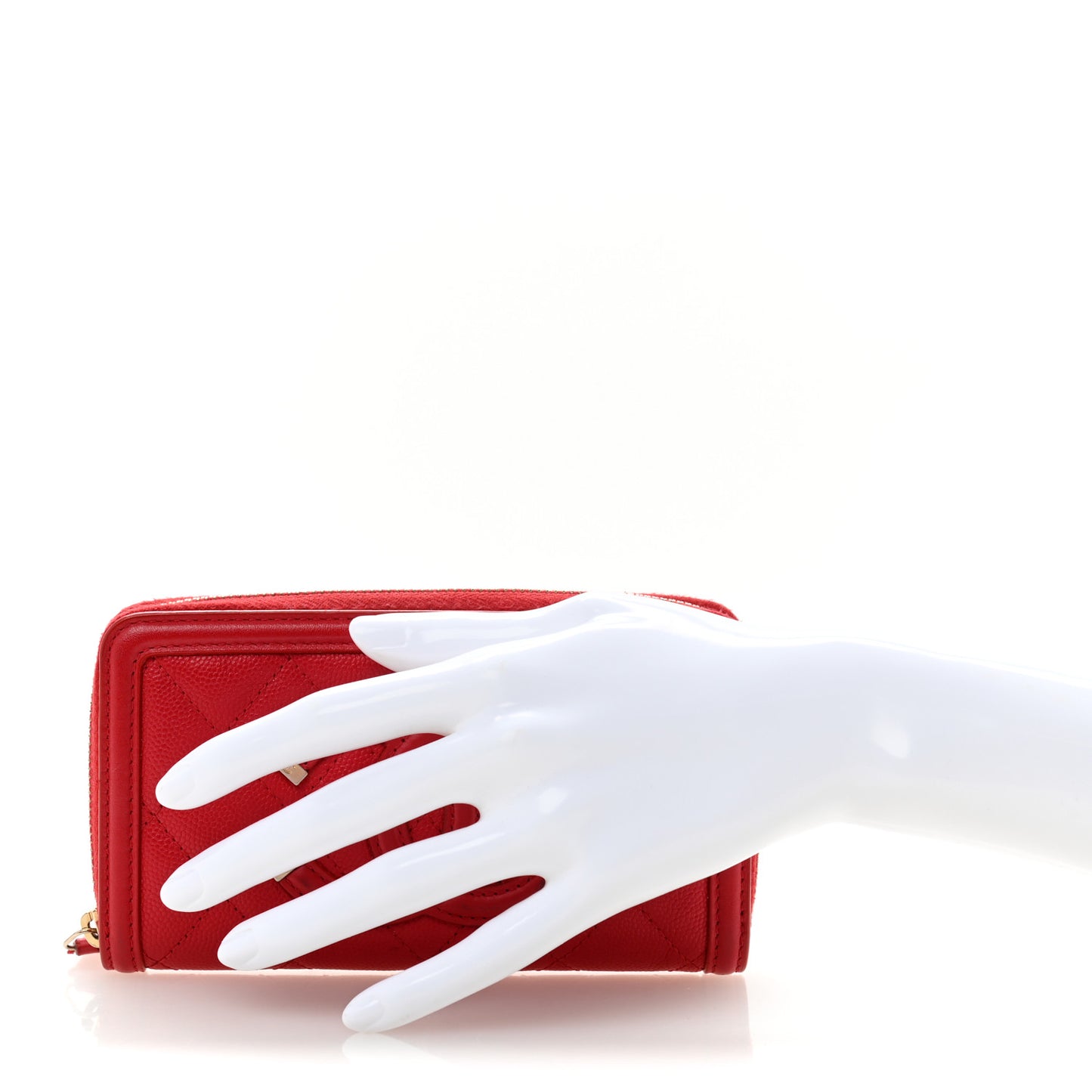 This is an authentic CHANEL Caviar Quilted Medium Filigree Zip Around Wallet in Dark Red. This stylish wallet is crafted of diamond quilted caviar leather in red. The wallet has a facing Chanel CC logo with gold accents and a gold wrap around zipper. This opens to a red leather interior with card slots and a central zipper pocket.Follow this item for alerts. Chanel is a registered trademark of Chanel. FASHIONPHILE is not affiliated with Chanel.