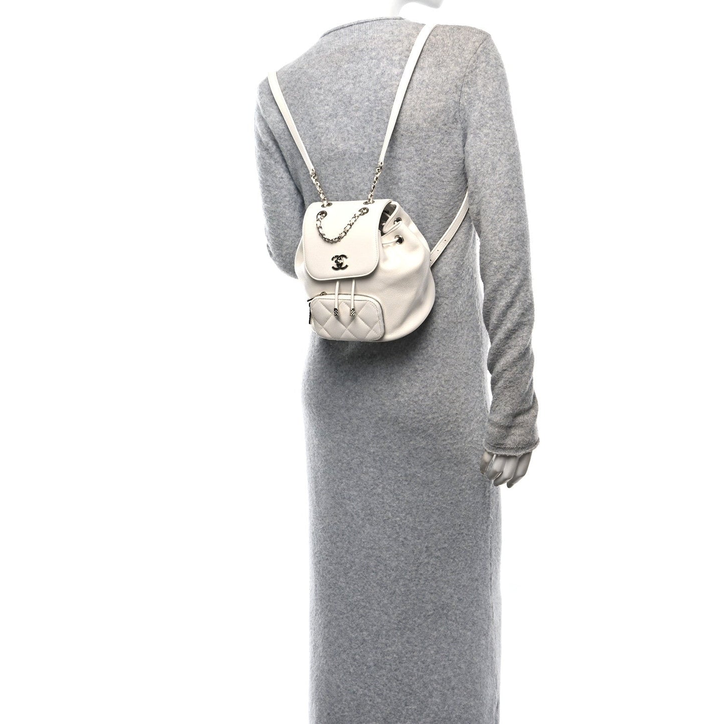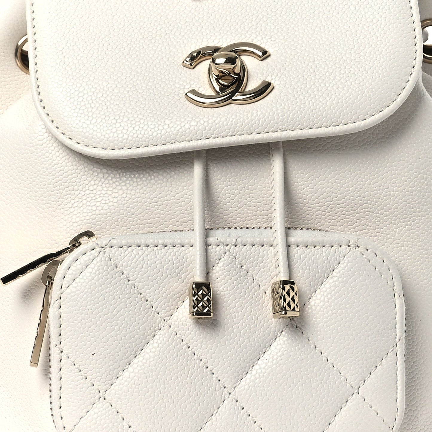 This is an authentic CHANEL Caviar Quilted Mini Business Affinity Backpack in White. This stylish backpack is beautifully crafted of caviar leather in white. It features a polished gold chain link leather threaded shoulder straps with leather shoulder pads. A facing external zipper pocket, a facing flap that opens with a polished gold Chanel CC turn lock, and a leather cinch cord. This opens to a spacious matching fabric interior with a patch pocket.Follow this item for alerts. Chanel is a registered trademark of Chanel. FASHIONPHILE is not affiliated with Chanel.