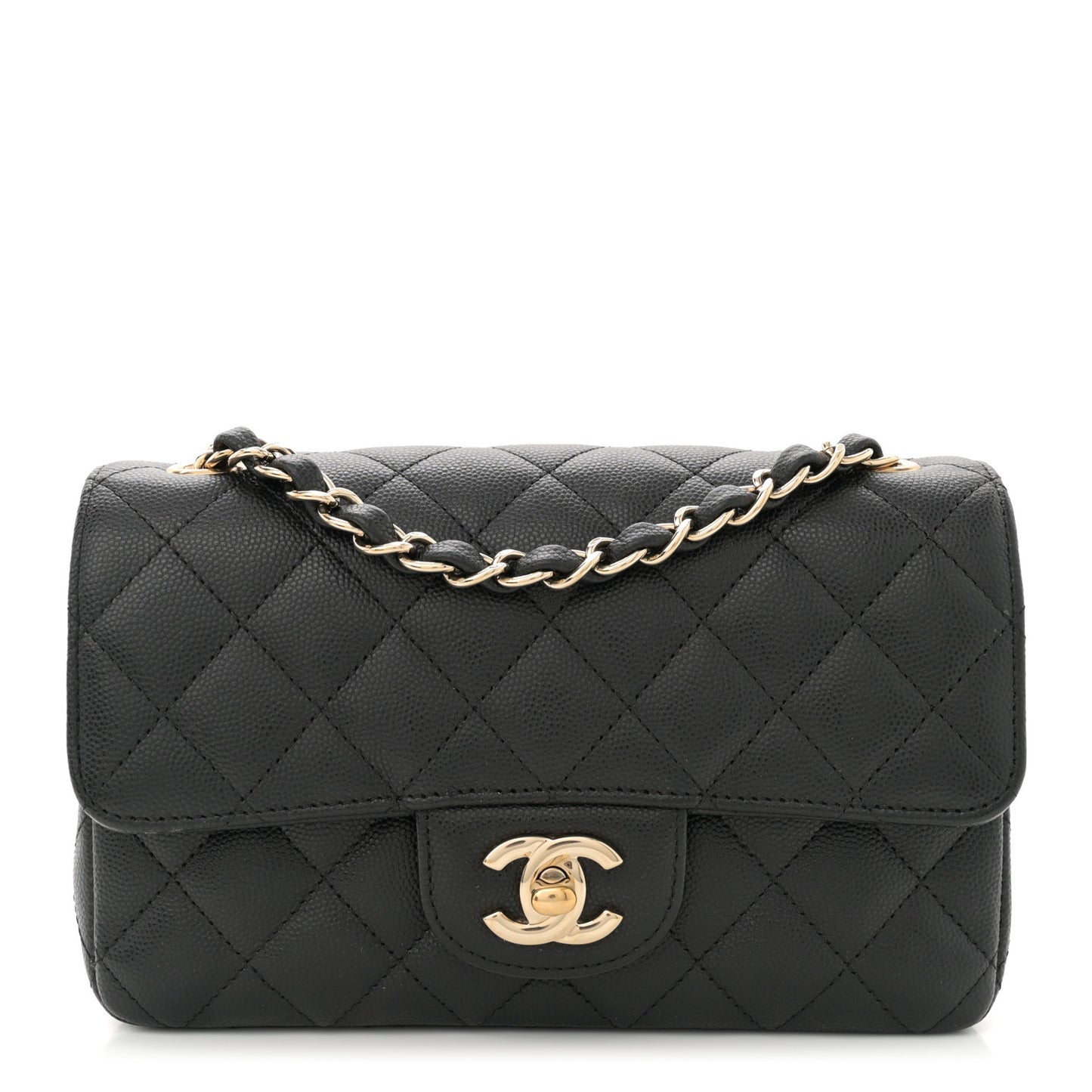 This is an authentic CHANEL Caviar Quilted Mini Rectangular Flap in Black. This chic mini crossbody classic is crafted of quilted caviar leather in black. The bag features a light gold chain link leather threaded shoulder strap and a light gold classic CC turn lock. This opens the flap to a black leather interior with zipper and patch pockets.Follow this item for alerts. Chanel is a registered trademark of Chanel. FASHIONPHILE is not affiliated with Chanel.