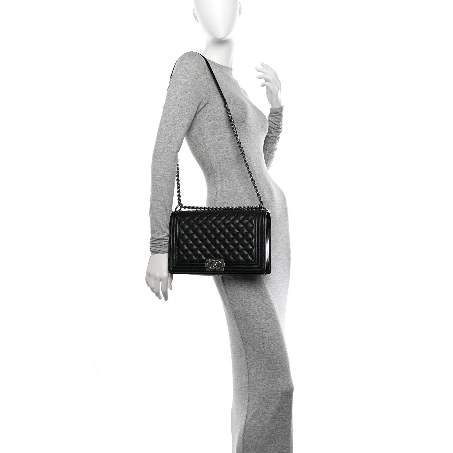 This is an authentic CHANEL Caviar Quilted New Medium Boy Flap in Black. This stylish shoulder bag is crafted of luxuriously soft diamond quilted lambskin leather with linear quilted borders in black. The bag features a ruthenium chain link shoulder strap with a leather shoulder pad and a matching Chanel boy CC push lock. This opens the full flap to a black fabric interior with zipper and flat pockets.Follow this item for alerts. Chanel is a registered trademark of Chanel. FASHIONPHILE is not affiliated with Chanel.