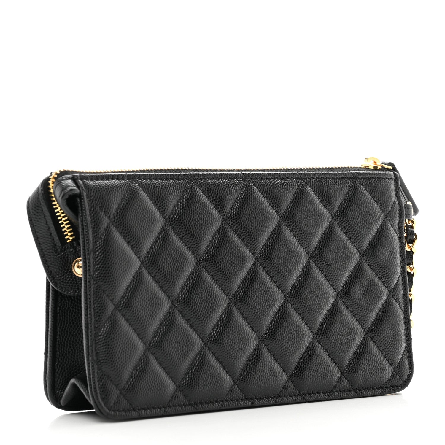 This is an authentic CHANEL Caviar Quilted Polly Pocket Pouch Black. This stylish Pouch is crafted of black textured diamond-quilted caviar leather. The bag features a polished gold leather threaded chain-link wrist strap and a gold Chanel CC logo. The bag opens with a top zipper to a black fabric interior with card slots and a zipper compartment.Follow this item for alerts. Chanel is a registered trademark of Chanel. FASHIONPHILE is not affiliated with Chanel.
