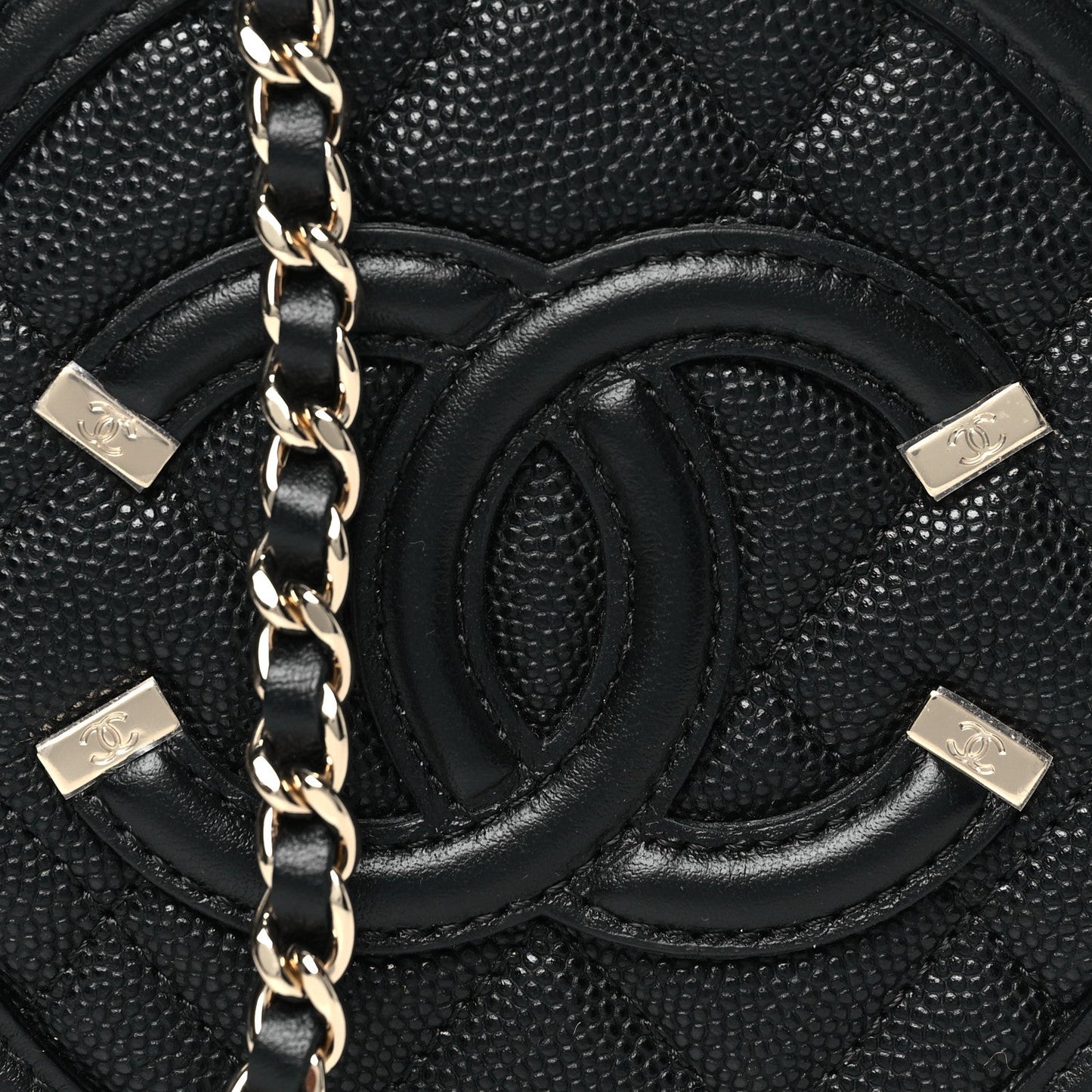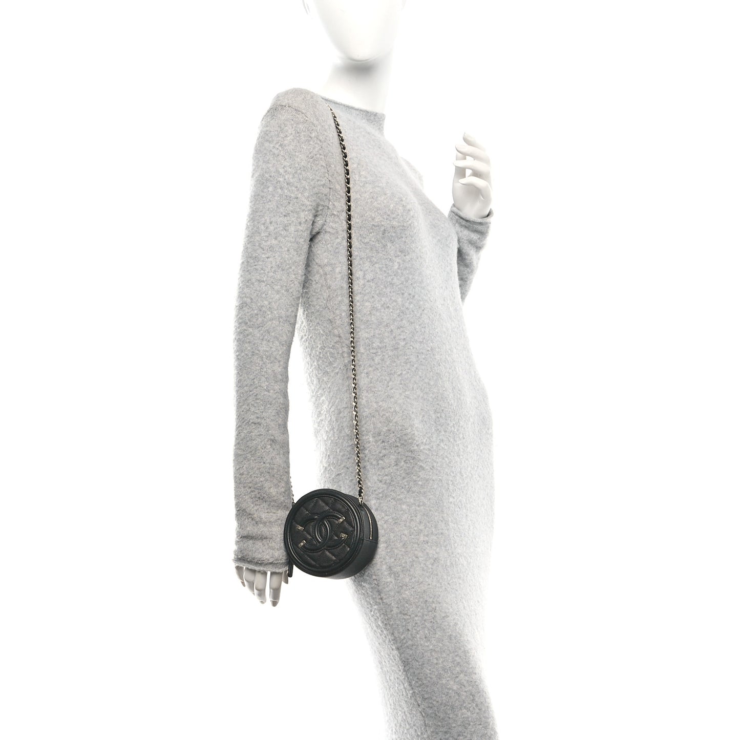 This is an authentic CHANEL Caviar Quilted Round Filigree Crossbody in Black. This stylish shoulder bag is crafted of luxurious caviar leather in black. The bag features a brass chain link leather threaded shoulder strap. This shoulder bag opens a top zipper to a fabric interior with a patch pocket.Follow this item for alerts. Chanel is a registered trademark of Chanel. FASHIONPHILE is not affiliated with Chanel.