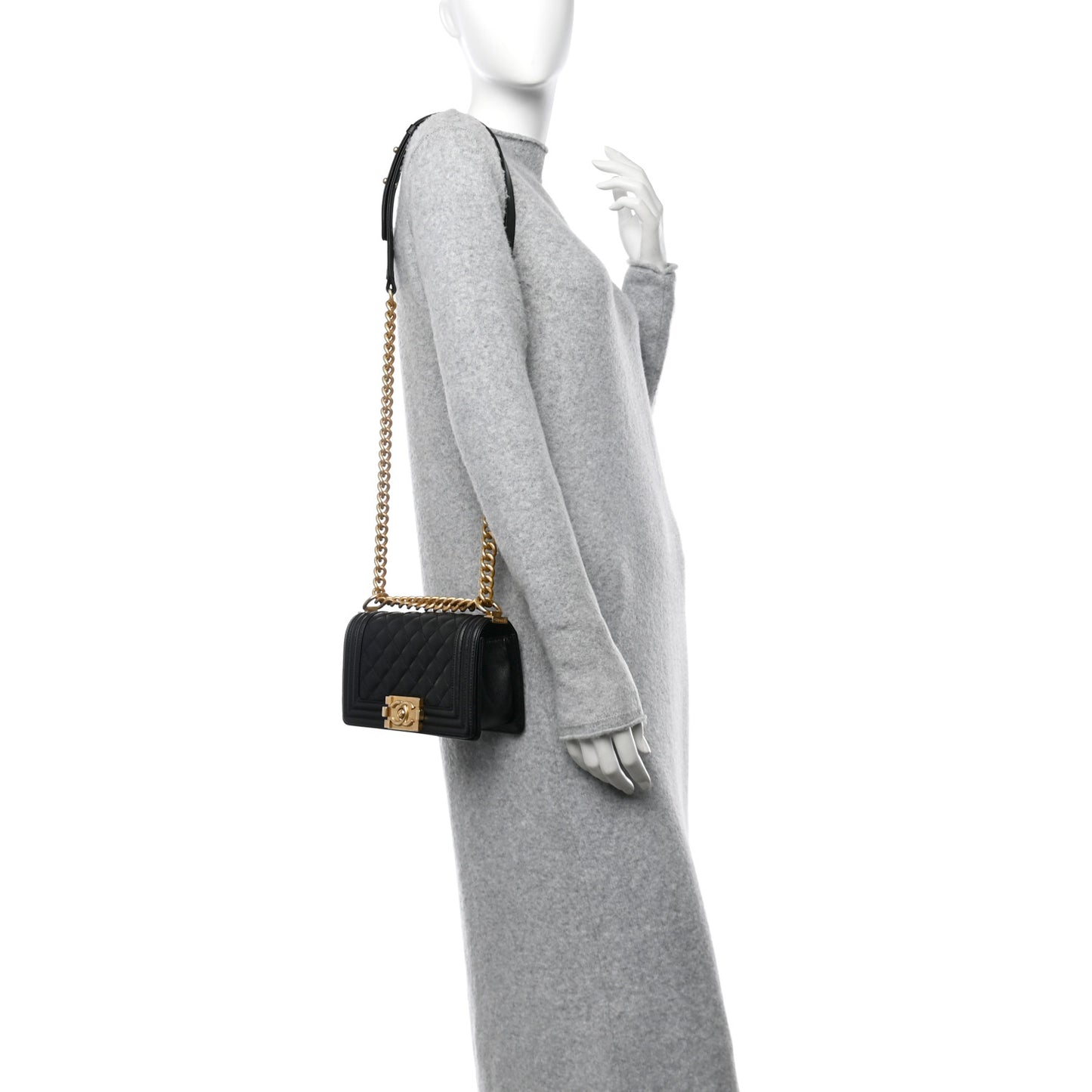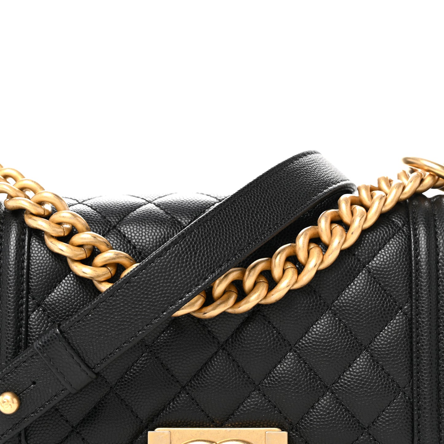 This is an authentic CHANEL Caviar Quilted Small Boy Flap in Black. This chic shoulder bag is finely crafted of rich caviar leather with signature diamond stitched quilting in black. The bag features an aged gold chain-link shoulder strap with a leather shoulder pad and a matching Chanel Boy CC press lock on the flap. This opens to a black fabric interior with a small patch pocket.Follow this item for alerts. Chanel is a registered trademark of Chanel. FASHIONPHILE is not affiliated with Chanel.