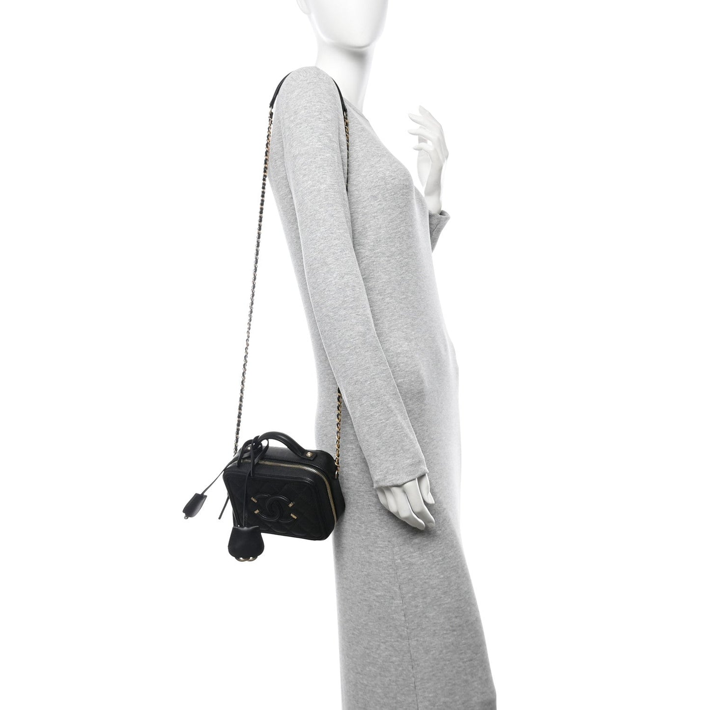 This is an authentic CHANEL Caviar Quilted Small CC Filigree Vanity Case in Black. This chic stylish travel bag is crafted of luxurious diamond quilted caviar leather in black. The elegant shoulder bag features a black leather handle, a polished gold chain leather threaded shoulder strap with a shoulder pad, and a large Channel CC stitched logo with polished gold tips on the front. The two top zippers open all around to a divided black leather interior with a patch pocket.Follow this item for alerts. Chanel is a registered trademark of Chanel. FASHIONPHILE is not affiliated with Chanel.