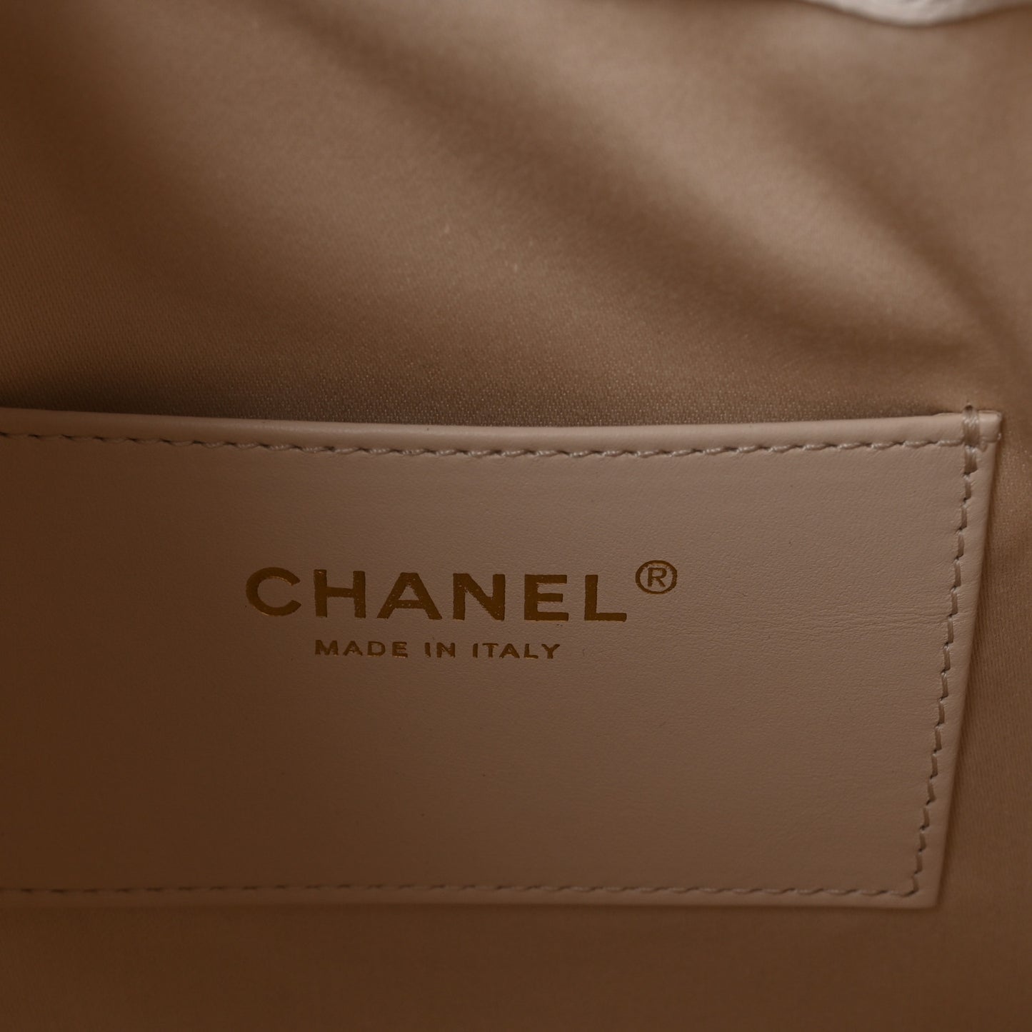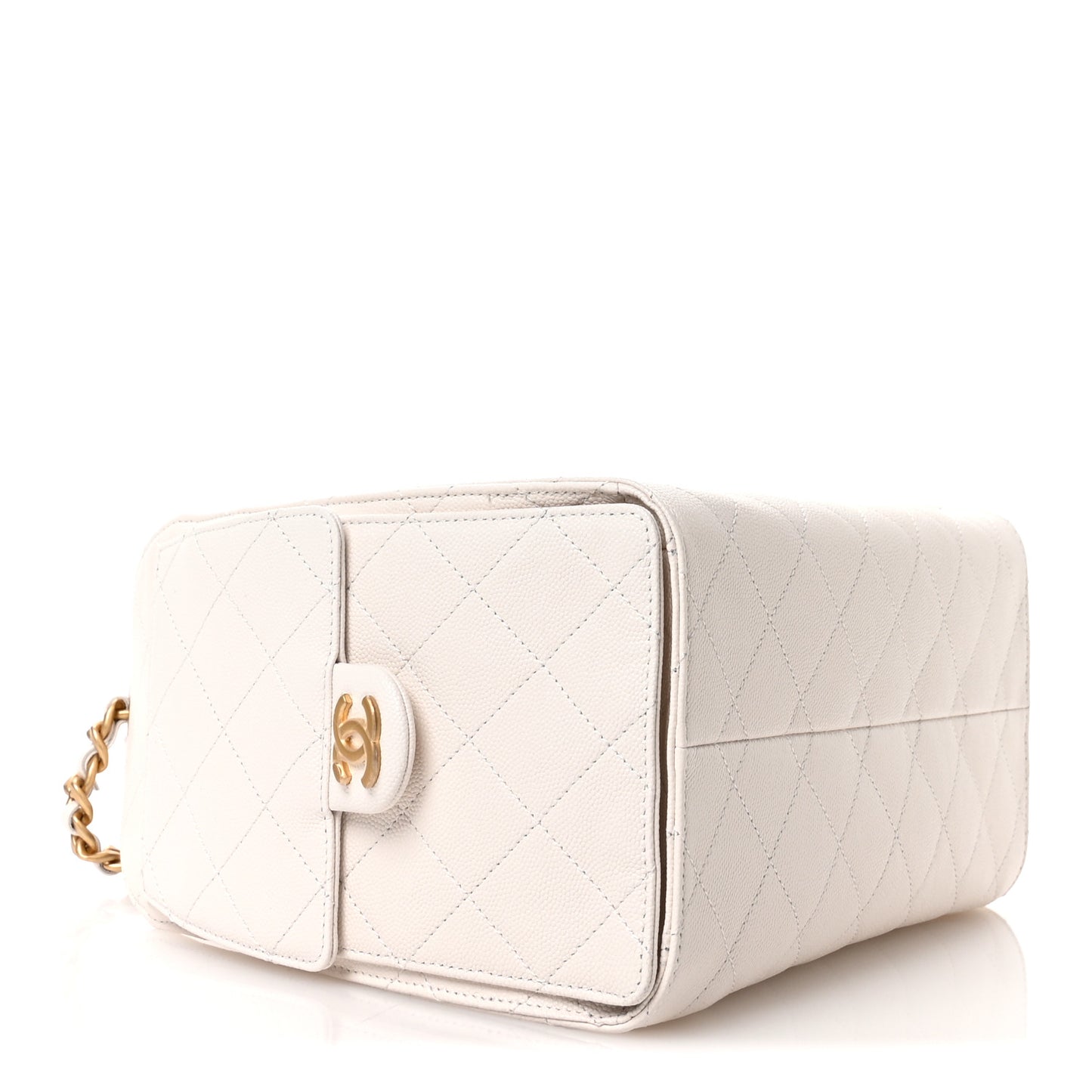 This is an authentic CHANEL Caviar Quilted 25 Small Handbag in White. This chic shoulder bag is crafted of diamond quilted caviar leather in white. It features magnetic flap pockets at the sides, a leather-threaded gold-toned chain strap, and a leather-threaded gold-toned top cinch cord with aged gold CC logo adjustment button. This opens the bag to a beige fabric interior with side patch pockets and a leather card slot.Follow this item for alerts. Chanel is a registered trademark of Chanel. FASHIONPHILE is not affiliated with Chanel.