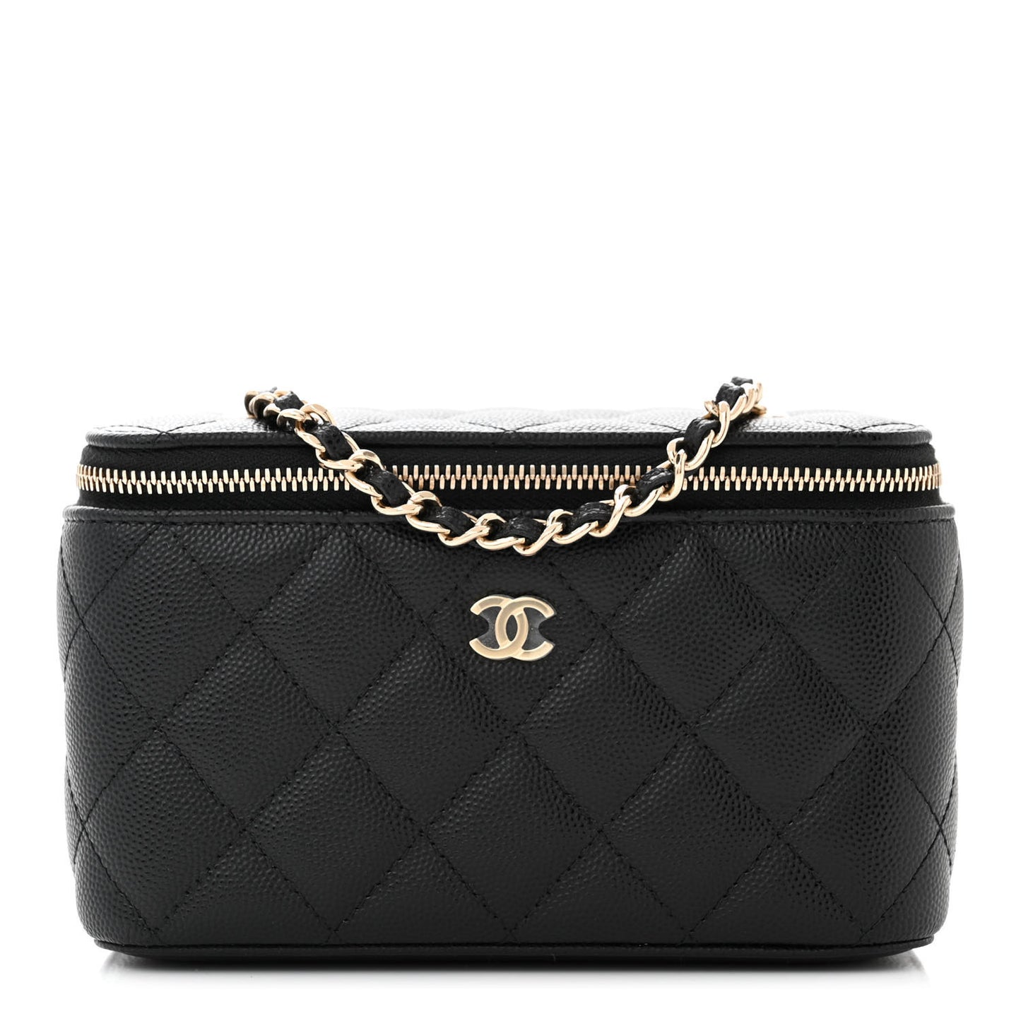 This is an authentic CHANEL Caviar Quilted Small Vanity Case With Chain in Black. This stylish crossbody is crafted of luxurious caviar leather in black. The bag features a leather threaded gold chain-link shoulder strap and gold hardware. The handbag features a 3/4 wrap-around zipper that opens to a fabric interior with card slots.Follow this item for alerts. Chanel is a registered trademark of Chanel. FASHIONPHILE is not affiliated with Chanel.