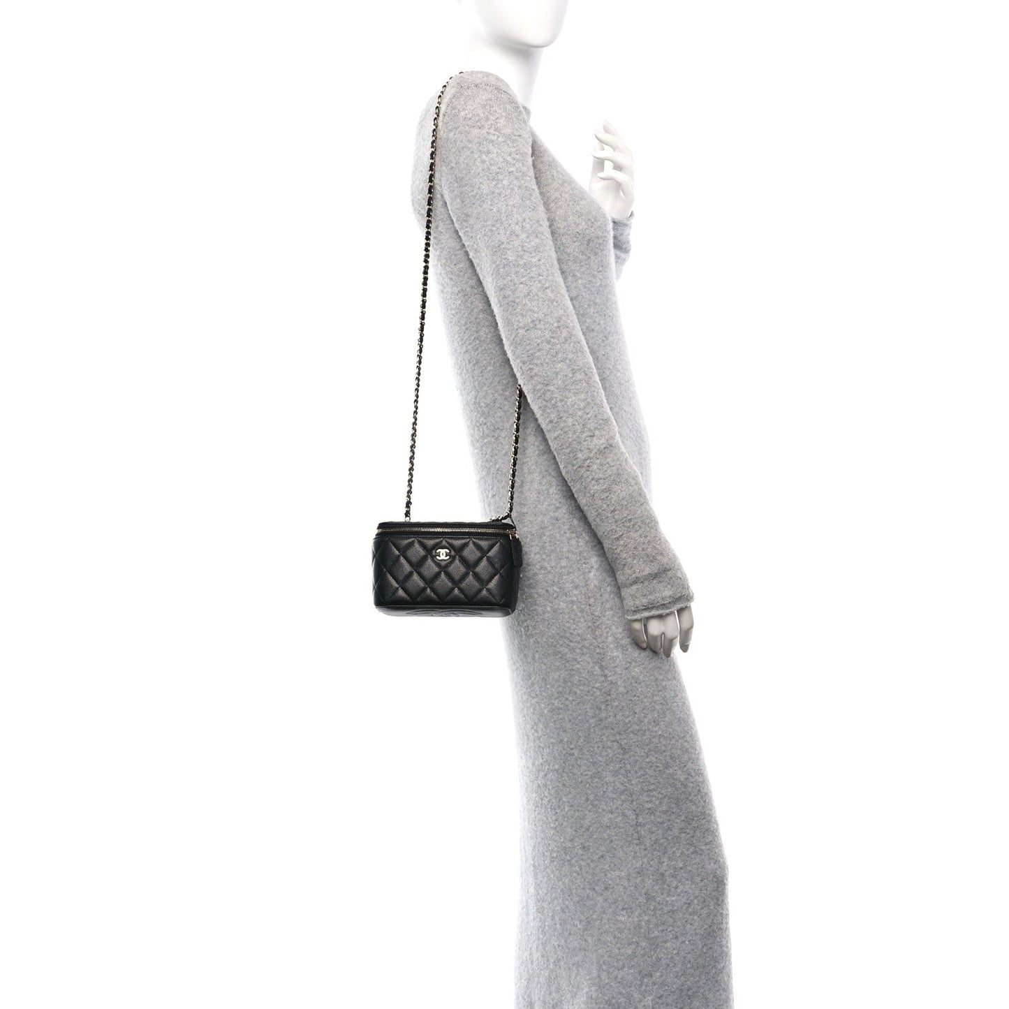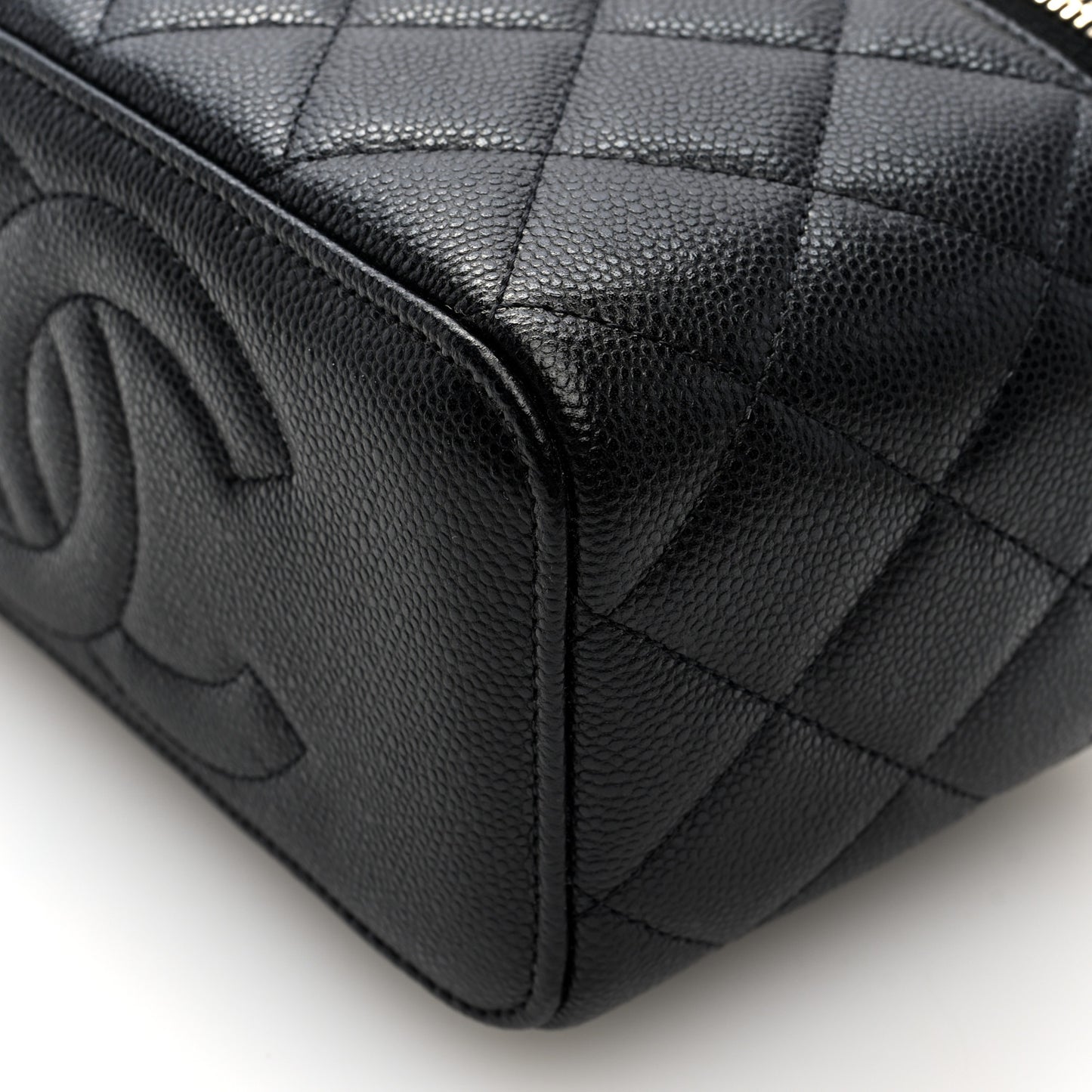This is an authentic CHANEL Caviar Quilted Small Vanity Case With Chain in Black. This stylish crossbody is crafted of luxurious caviar leather in black. The bag features a leather threaded gold chain-link shoulder strap and gold hardware. The handbag features a 3/4 wrap-around zipper that opens to a fabric interior with card slots.Follow this item for alerts. Chanel is a registered trademark of Chanel. FASHIONPHILE is not affiliated with Chanel.