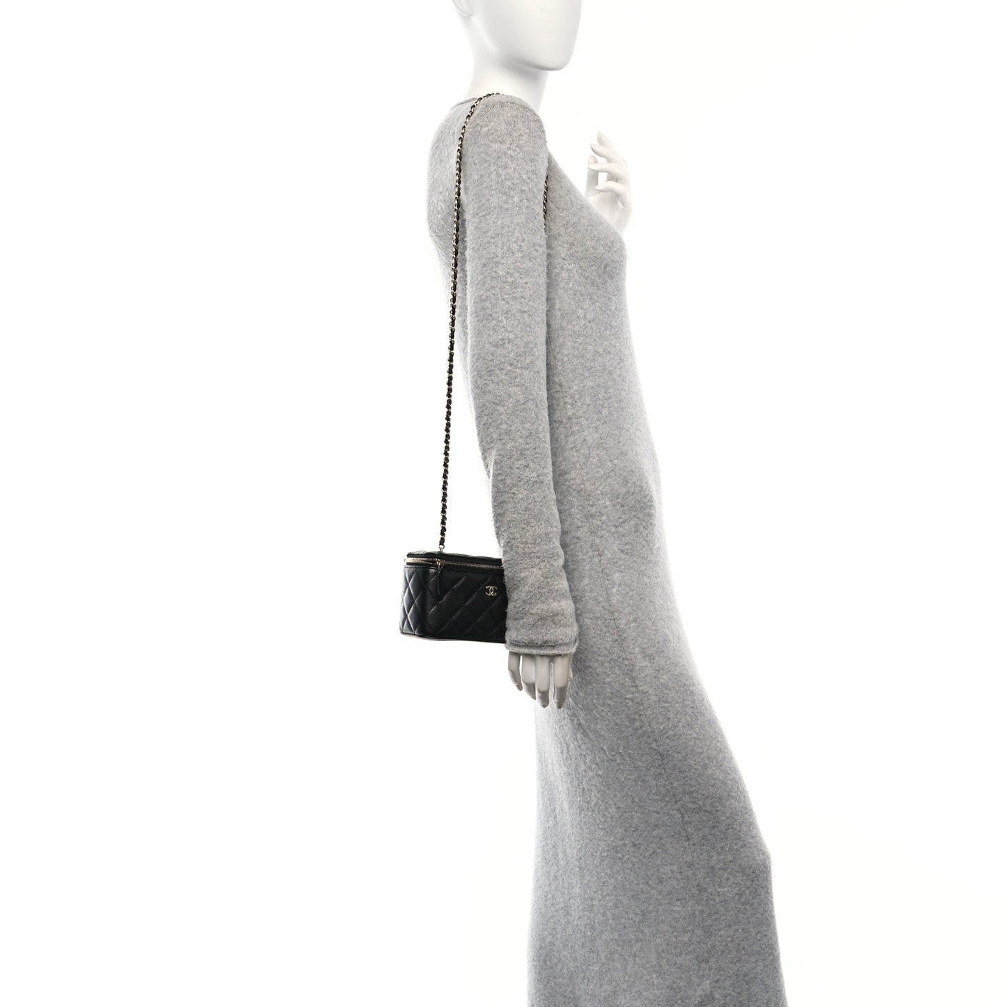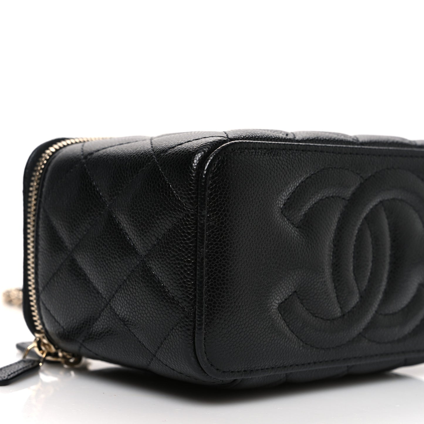 This is an authentic CHANEL Caviar Quilted Small Vanity Case With Chain in Black. This crossbody is crafted of black caviar leather and gold hardware. The top opens to a burgundy leather interior with a mirror.Follow this item for alerts. Chanel is a registered trademark of Chanel. FASHIONPHILE is not affiliated with Chanel.