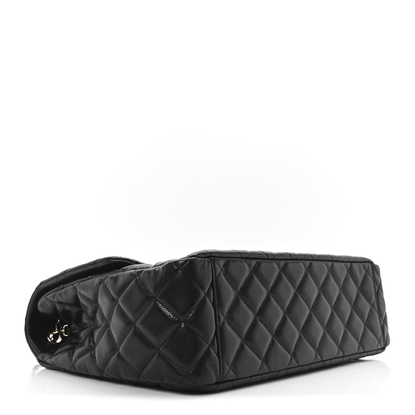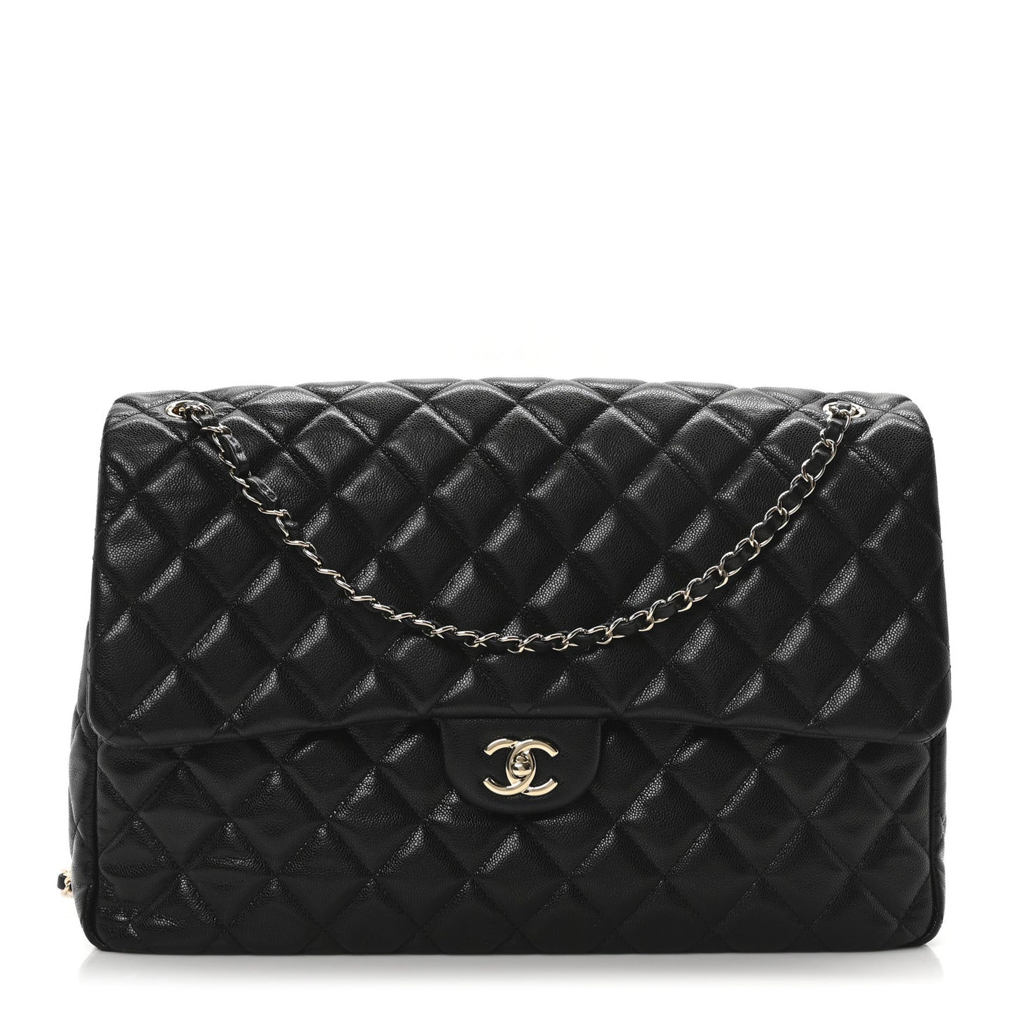 This is an authentic CHANEL Caviar Quilted XXL Travel Flap Bag in Black. This travel bag is crafted of black calfskin quilted leather in black. The tote features gold chain-link shoulder strap threaded with black leather, a rear pocket, and gold hardware. The CC turn lock opens to a spacious black fabric interior with zipper and patch pockets.Follow this item for alerts. Chanel is a registered trademark of Chanel. FASHIONPHILE is not affiliated with Chanel.