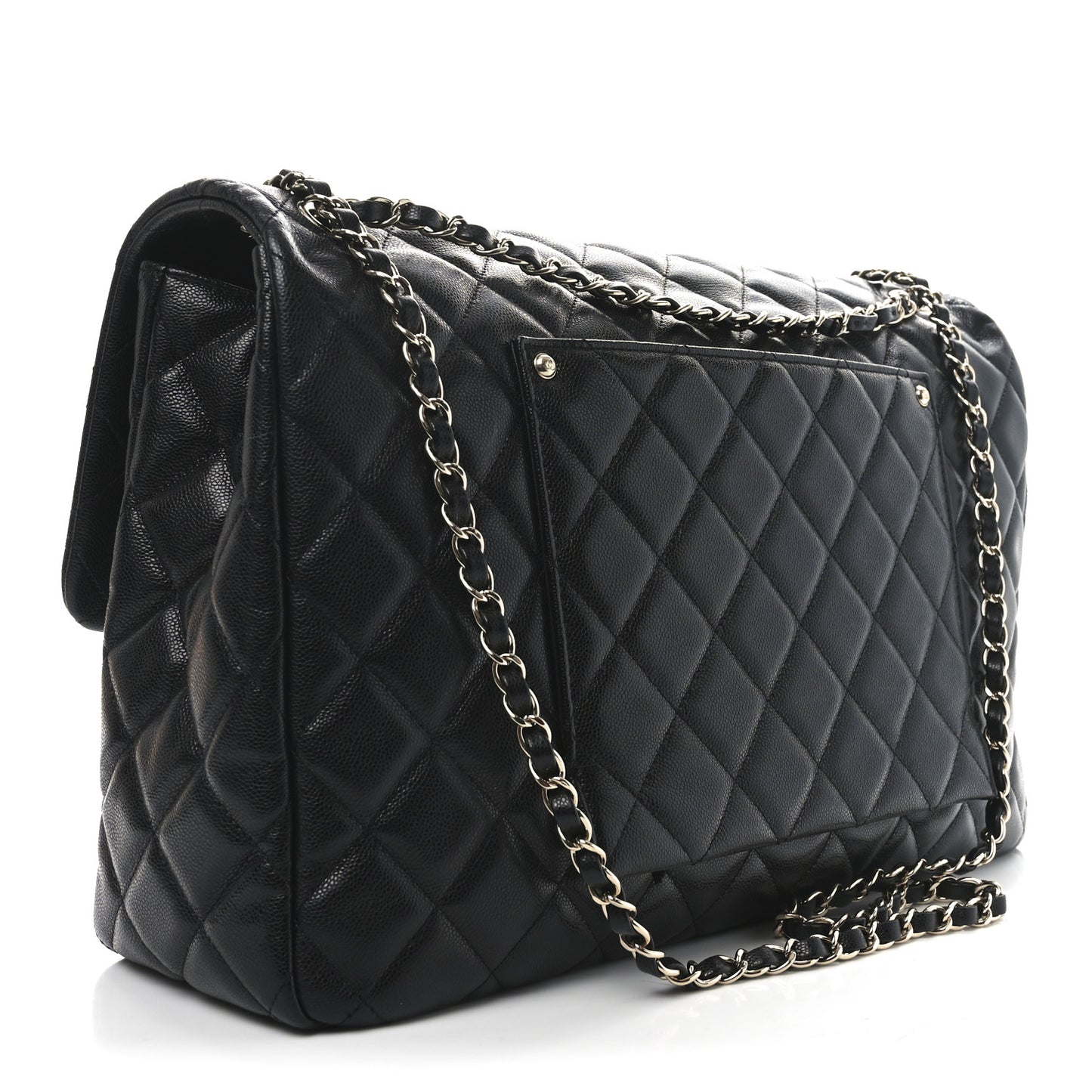 This is an authentic CHANEL Caviar Quilted XXL Travel Flap Bag in Black. This travel bag is crafted of black calfskin quilted leather in black. The tote features gold chain-link shoulder strap threaded with black leather, a rear pocket, and gold hardware. The CC turn lock opens to a spacious black fabric interior with zipper and patch pockets.Follow this item for alerts. Chanel is a registered trademark of Chanel. FASHIONPHILE is not affiliated with Chanel.