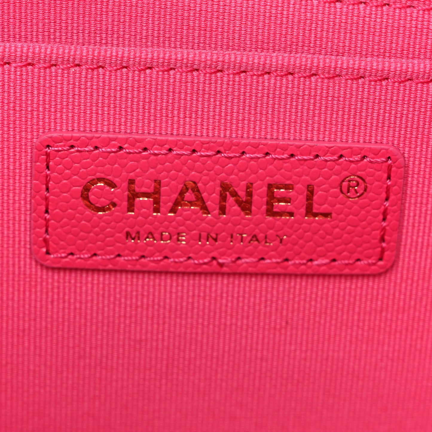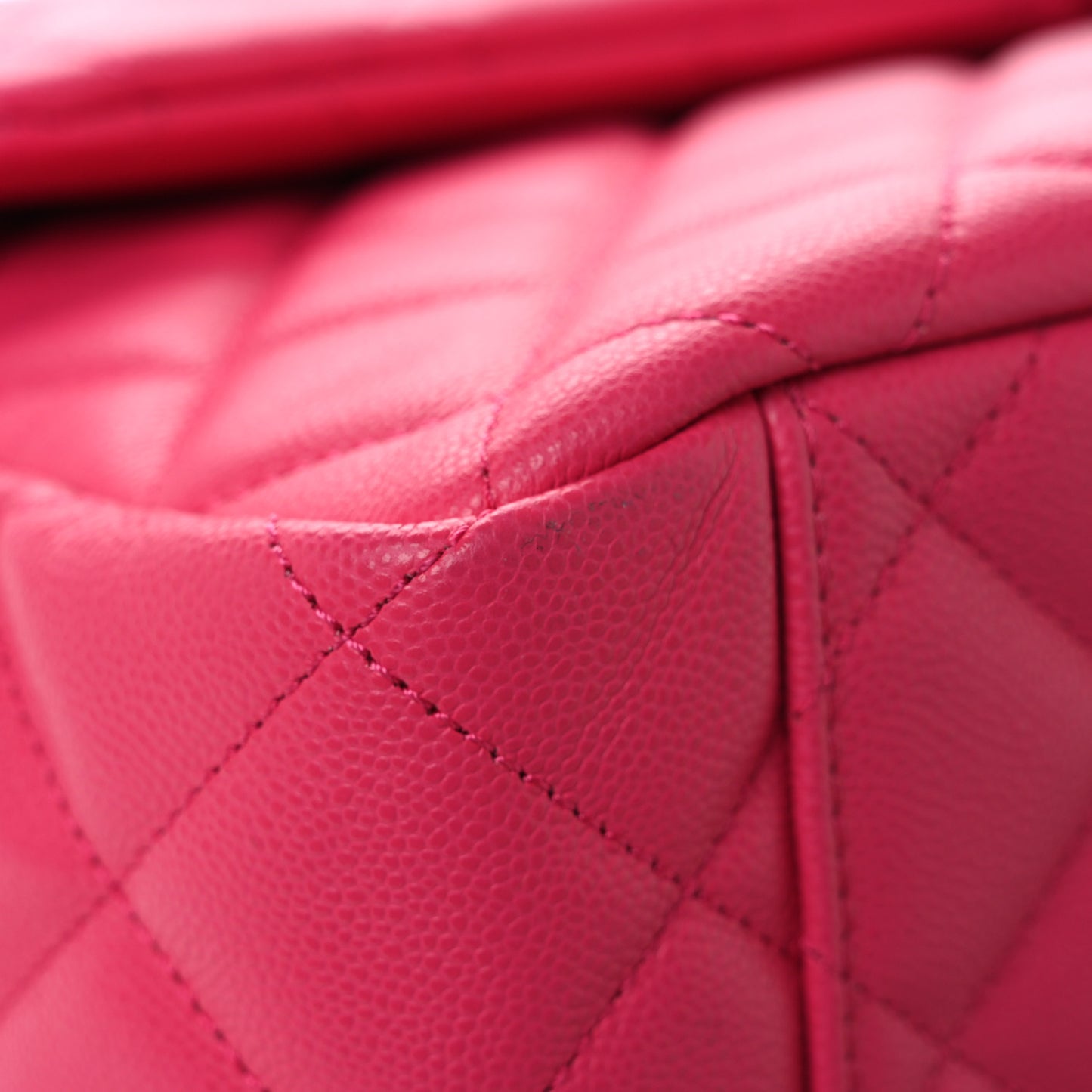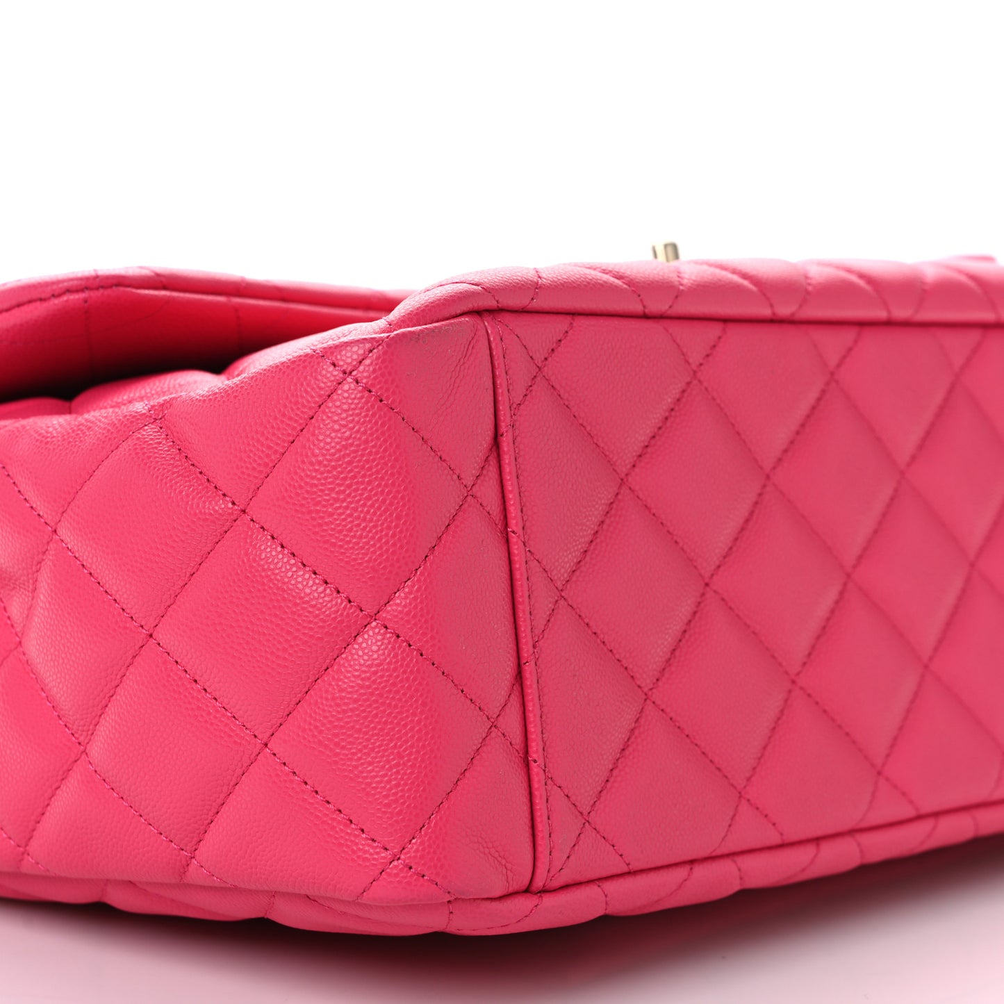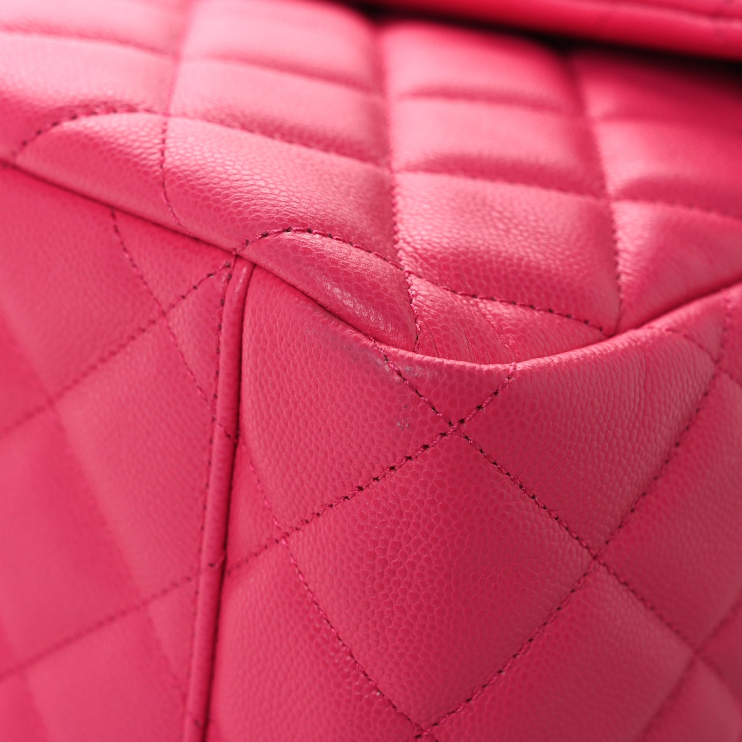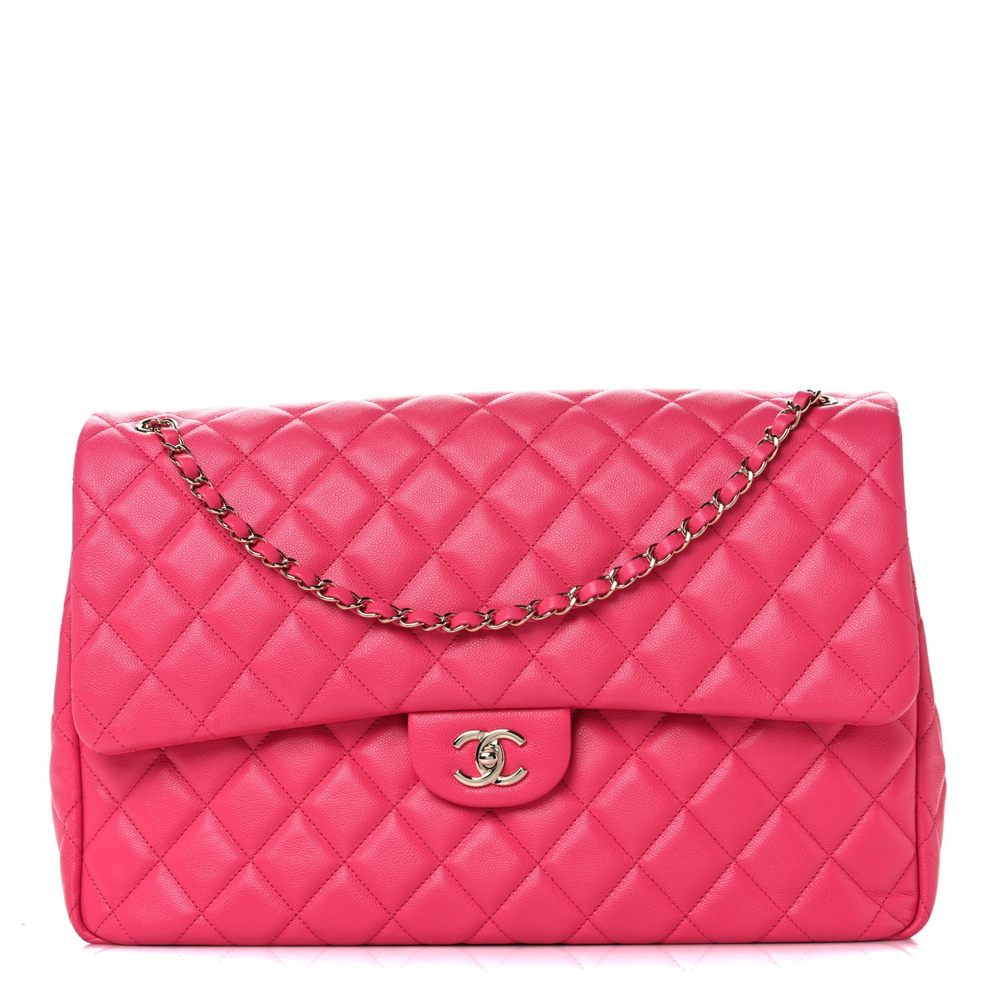 This is an authentic CHANEL Caviar Quilted XXL Travel Flap Bag in Dark Pink. This chic oversized flap is crafted of grained calfskin quilted leather in pink. The shoulder bag features a leather threaded gold chain link shoulder strap. The front Chanel CC turn lock opens to a spacious pink fabric interior with zipper and patch pockets. This roomy bag is ideal for travel with the iconic look of Chanel!Follow this item for alerts. Chanel is a registered trademark of Chanel. FASHIONPHILE is not affiliated with Chanel.