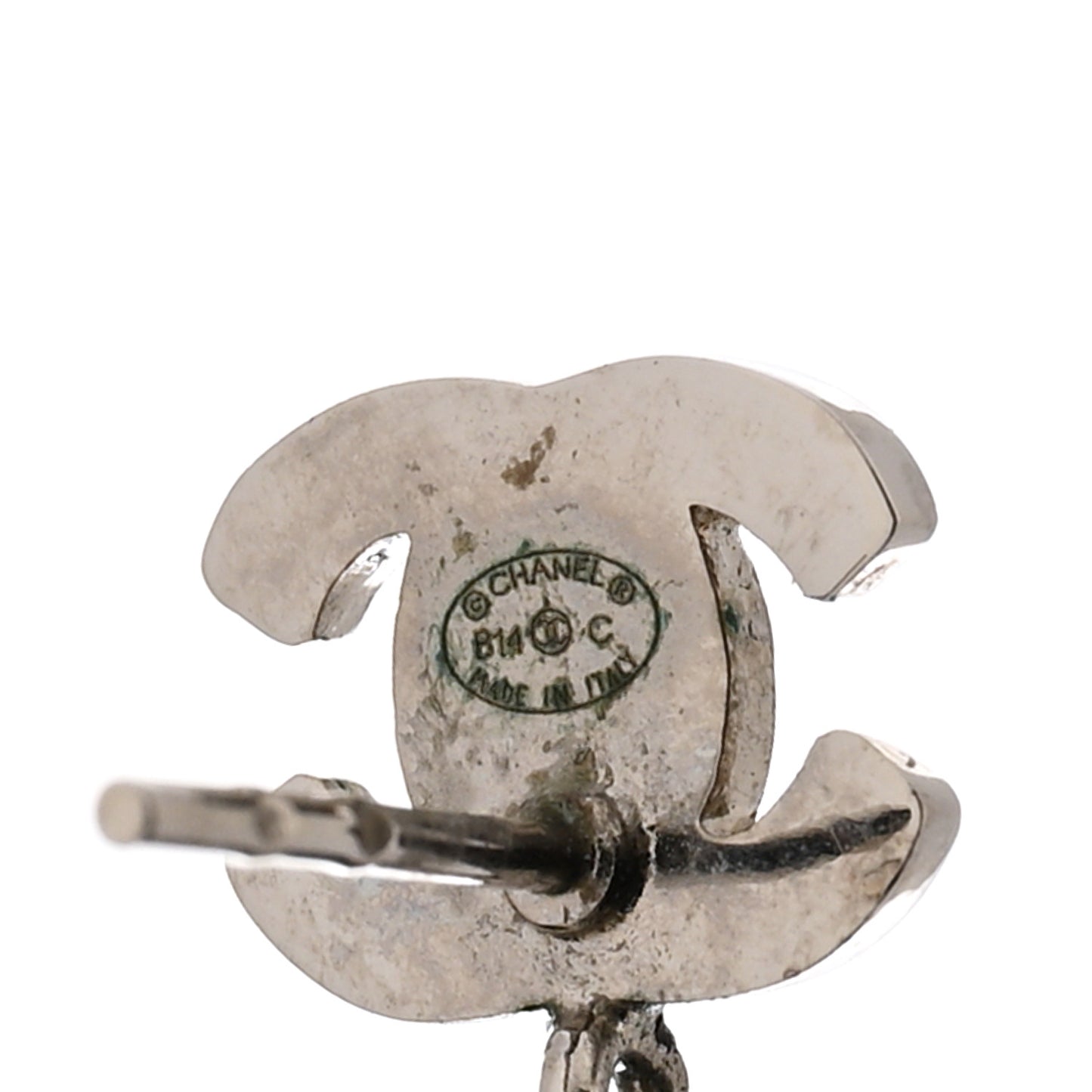 This is an authentic pair of CHANEL Crystal Pearl CC Drop Earrings in Silver and Pearly White. These elegant earrings feature a polished silver crystal encrusted CC logo with a dangling white resin pearl.Follow this item for alerts. Chanel is a registered trademark of Chanel. FASHIONPHILE is not affiliated with Chanel.