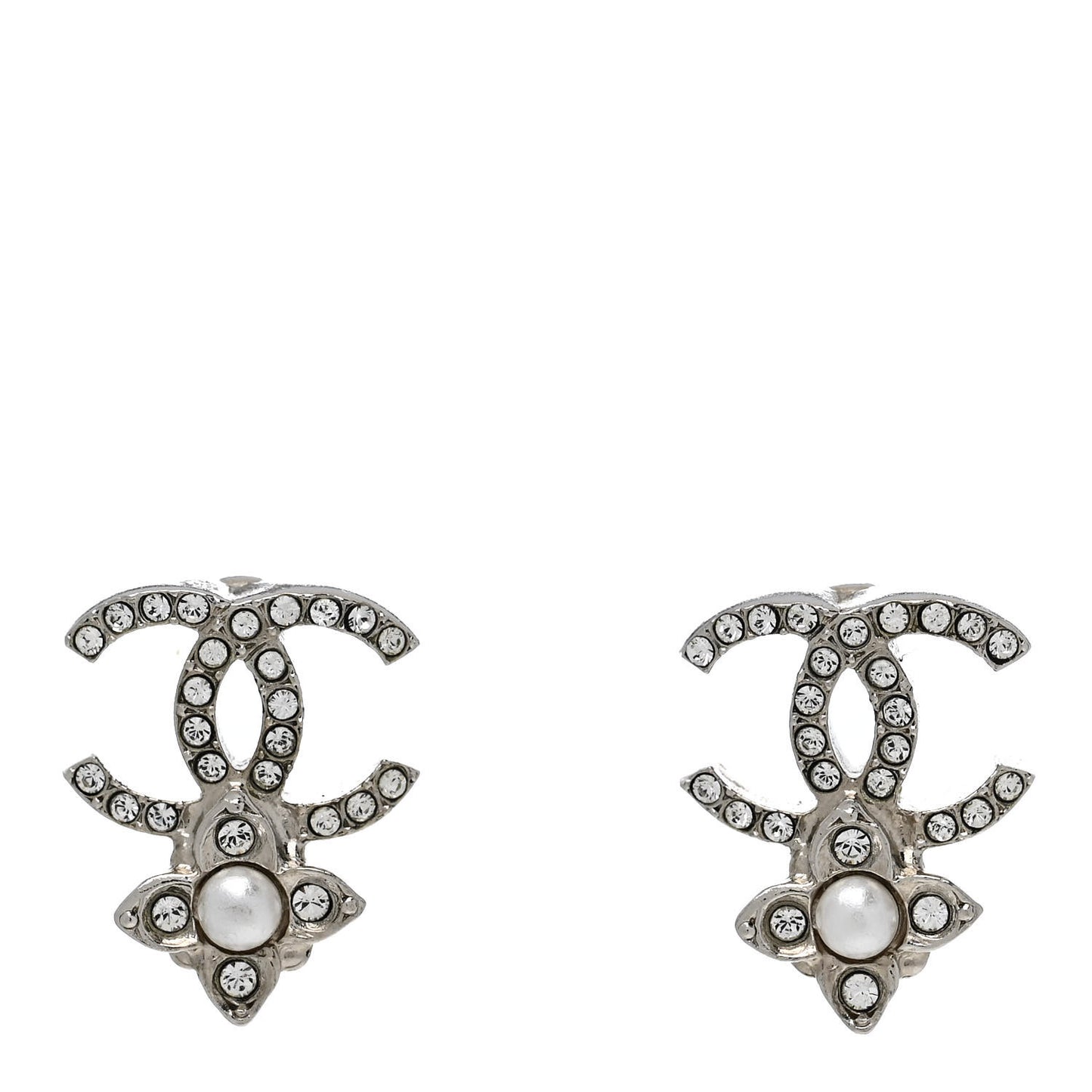 This is an authentic pair of CHANEL Crystal Pearl Flower CC Earrings in Silver. These stylish silver-tone earrings each feature a crystal-encrusted CC logo stud with a resin pearl flower accent.Follow this item for alerts. Chanel is a registered trademark of Chanel. FASHIONPHILE is not affiliated with Chanel.