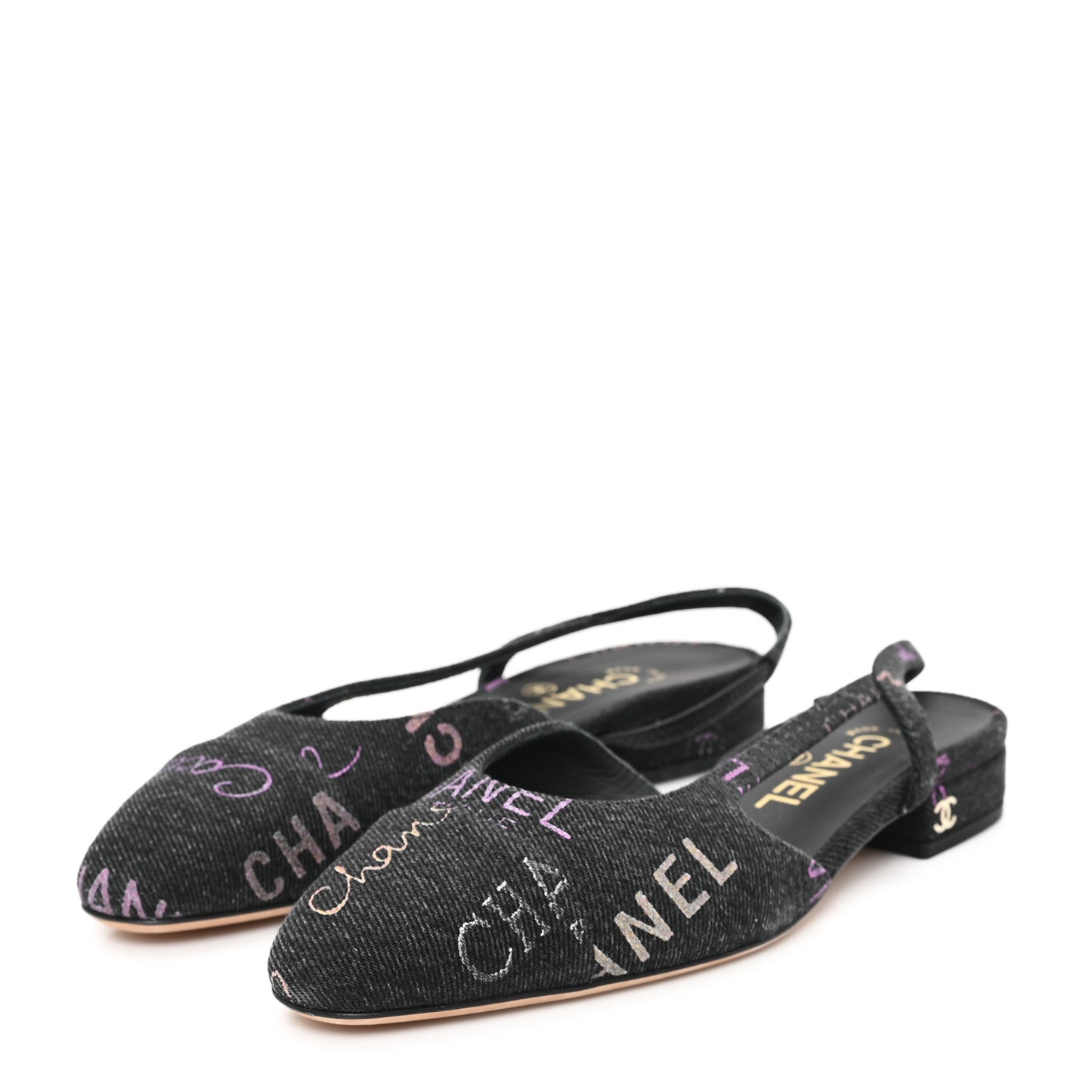 This is an authentic pair of CHANEL Denim Cap Toe Denim Mood Slingback Flats 36 in Black and Multicolor. These slingback pumps are crafted of dark grey denim, featuring a matching denim cap toe, and a small polished silver Chanel logo on the 1-inch heel.Follow this item for alerts. Chanel is a registered trademark of Chanel. FASHIONPHILE is not affiliated with Chanel.