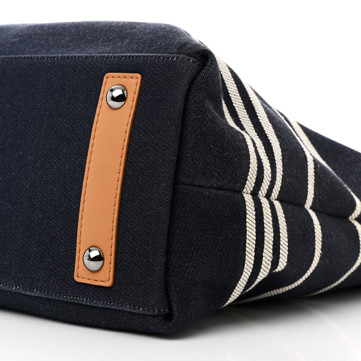 This is an authentic CHANEL Denim Large Shopping Tote in Blue. This chic tote is crafted of denim in dark blue. The bag features blue and white denim top handles, brown leather shoulder straps and silver hardware. The closure strap opens to a dark blue partitioned fabric interior with a central zipper compartment and two open compartments on either side.Follow this item for alerts. Chanel is a registered trademark of Chanel. FASHIONPHILE is not affiliated with Chanel.