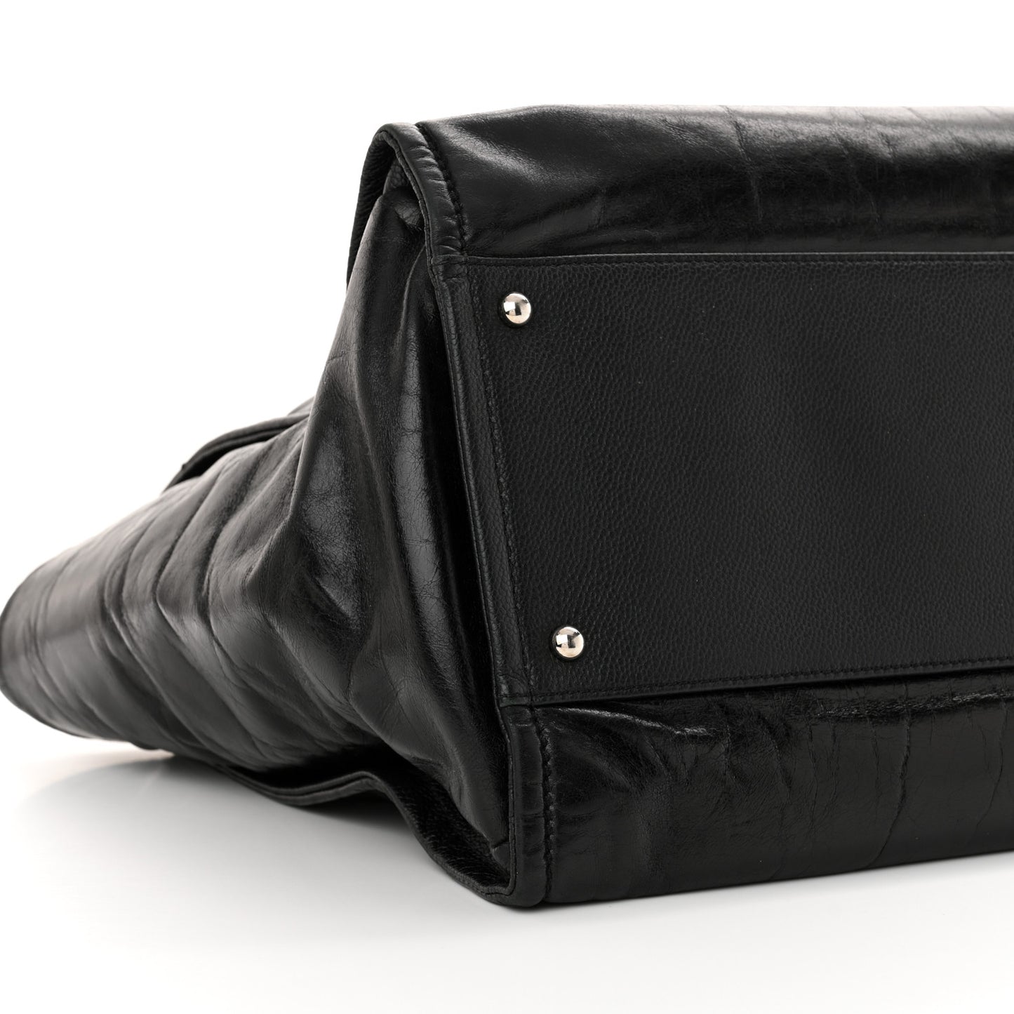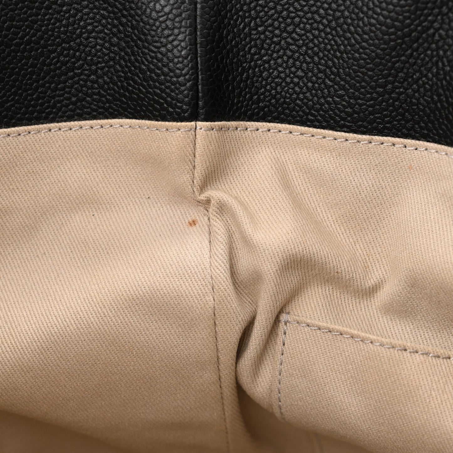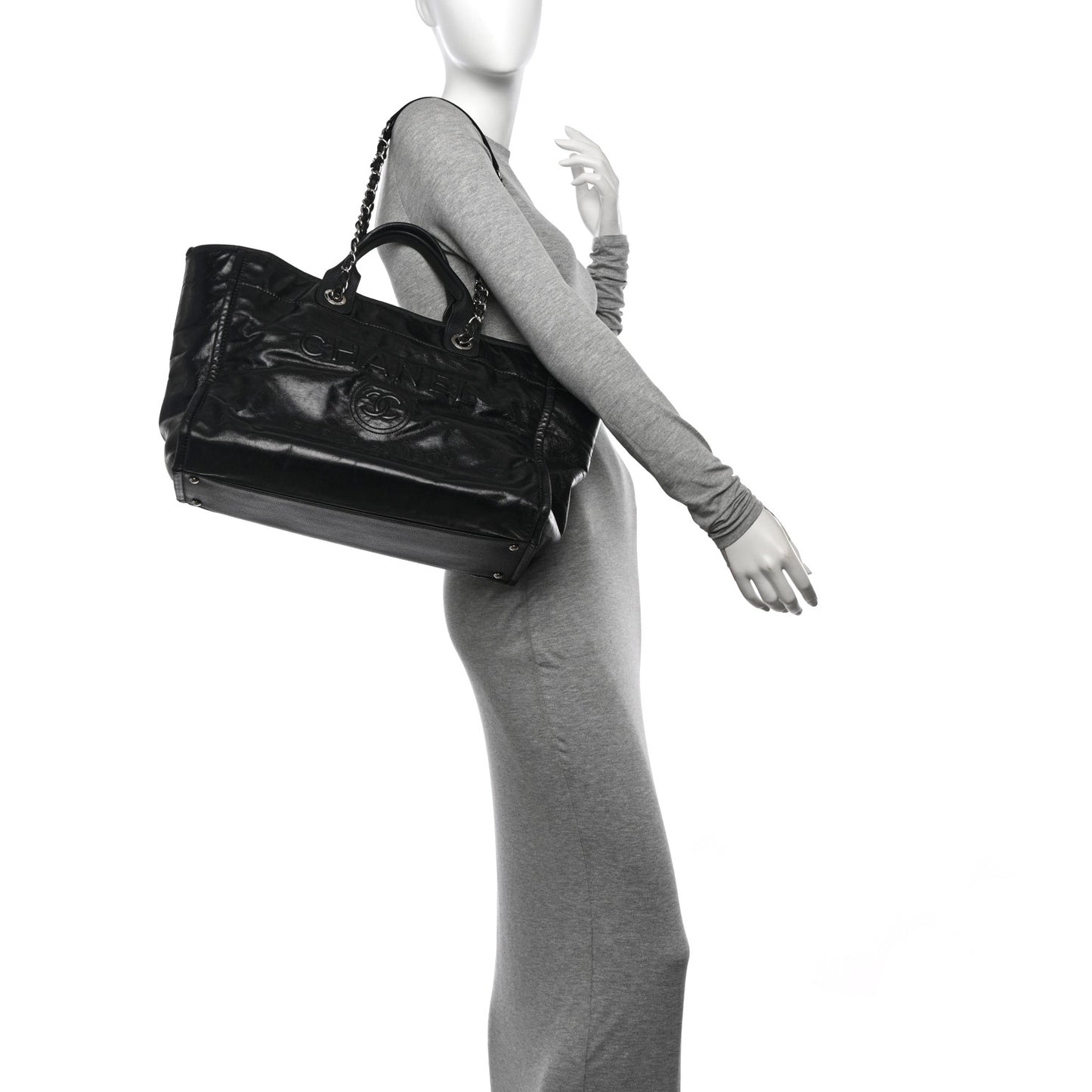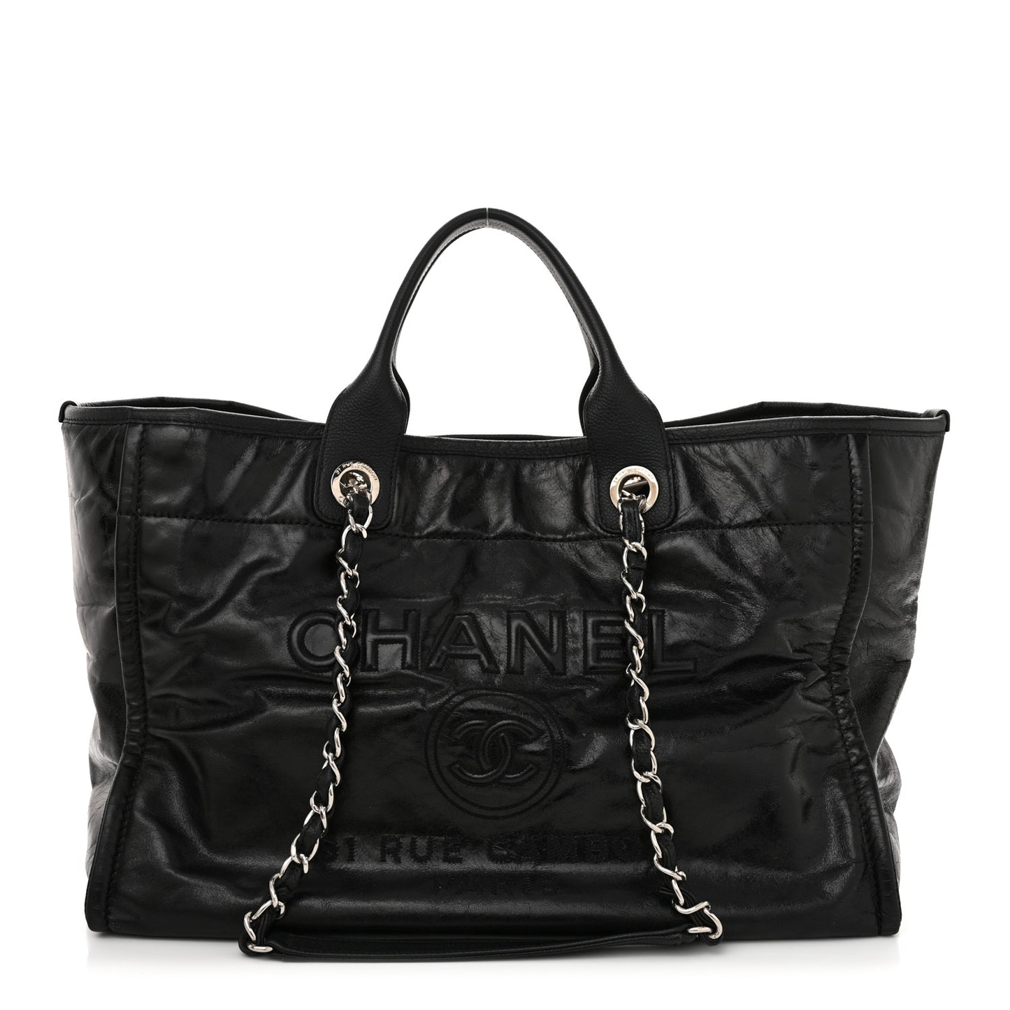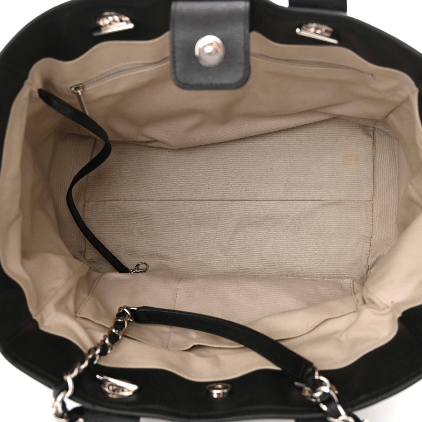 This is an authentic CHANEL Glazed Calfskin Medium Deauville Tote in Black. This tote is crafted of glazed calfskin leather in black with a Chanel logo stitched on the front. The bag features a classic quilted slip pocket at the back, silver chainlink leather threaded shoulder straps with caviar leather shoulder pads, and leather top handles. The top is open to a beige fabric interior with zipper and patch pockets and a leather strap with hook clasp to attach to your keys or accessories for easy access. The top is secured across with a magnetic strap.Follow this item for alerts. Chanel is a registered trademark of Chanel. FASHIONPHILE is not affiliated with Chanel.