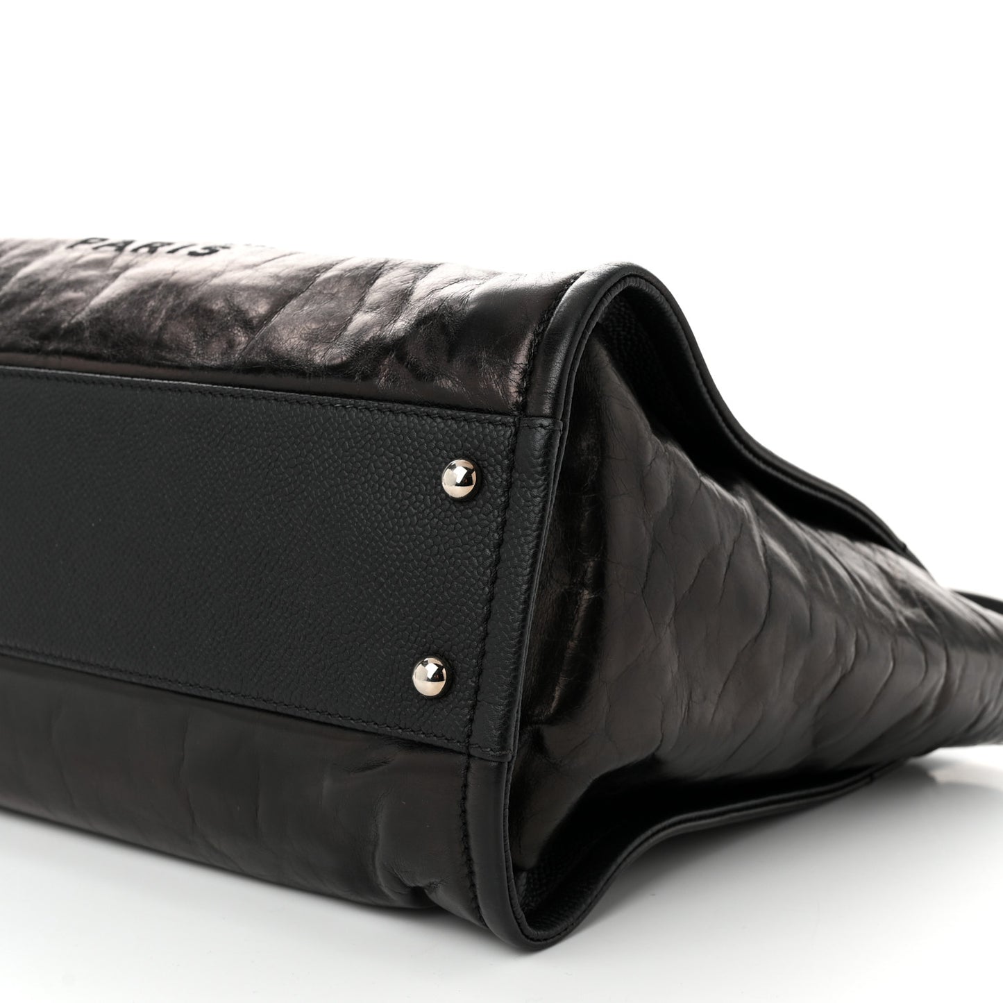 This is an authentic CHANEL Glazed Calfskin Small Deauville Tote in Black. This lovely tote is crafted of glazed calfskin leather stitched with a historic advertisement logo. The bag features silver chain link leather threaded shoulder straps with caviar leather shoulder pads and trim. The top opens to a beige fabric interior with zipper and patch pockets.Follow this item for alerts. Chanel is a registered trademark of Chanel. FASHIONPHILE is not affiliated with Chanel.