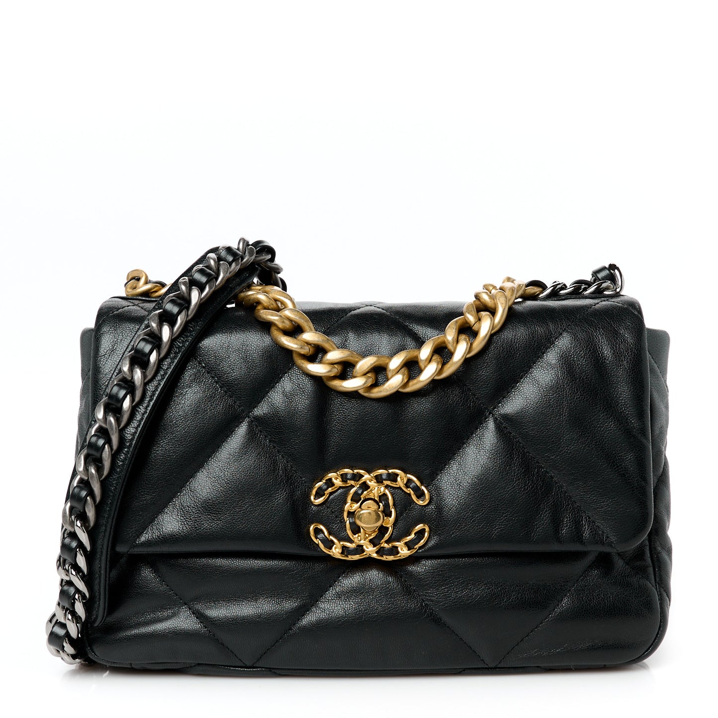 This is an authentic CHANEL Goatskin Quilted Medium Chanel 19 Flap in Black. This pillowy soft shoulder bag is crafted of oversized quilted goatskin leather in black. The refined bag features a chain detail CC turn-lock on the flap, a magnetic snap pocket on the back, a chunky matte gold chain top handle, and a leather threaded gradient gold to ruthenium chain-link shoulder strap. The front flap opens to a red fabric interior with a zipper pocket.Follow this item for alerts. Chanel is a registered trademark of Chanel. FASHIONPHILE is not affiliated with Chanel.