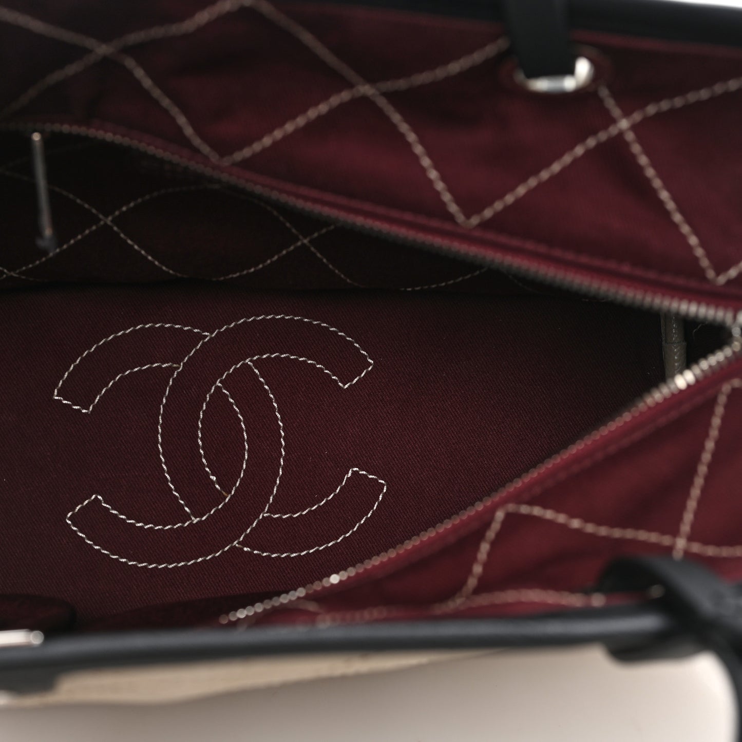 This is an authentic CHANEL Grained Calfskin Medium Fever Shopping Tote in Beige. This lovely oversized tote is crafted of diamond stitched calfskin leather in beige. The bag features black leather strap handles, black trim, and a silver hanging Chanel CC logo medallion. The top is open to a burgundy fabric interior with contrasting white diamond quilted stitching as well as zipper and patch pockets.Follow this item for alerts. Chanel is a registered trademark of Chanel. FASHIONPHILE is not affiliated with Chanel.