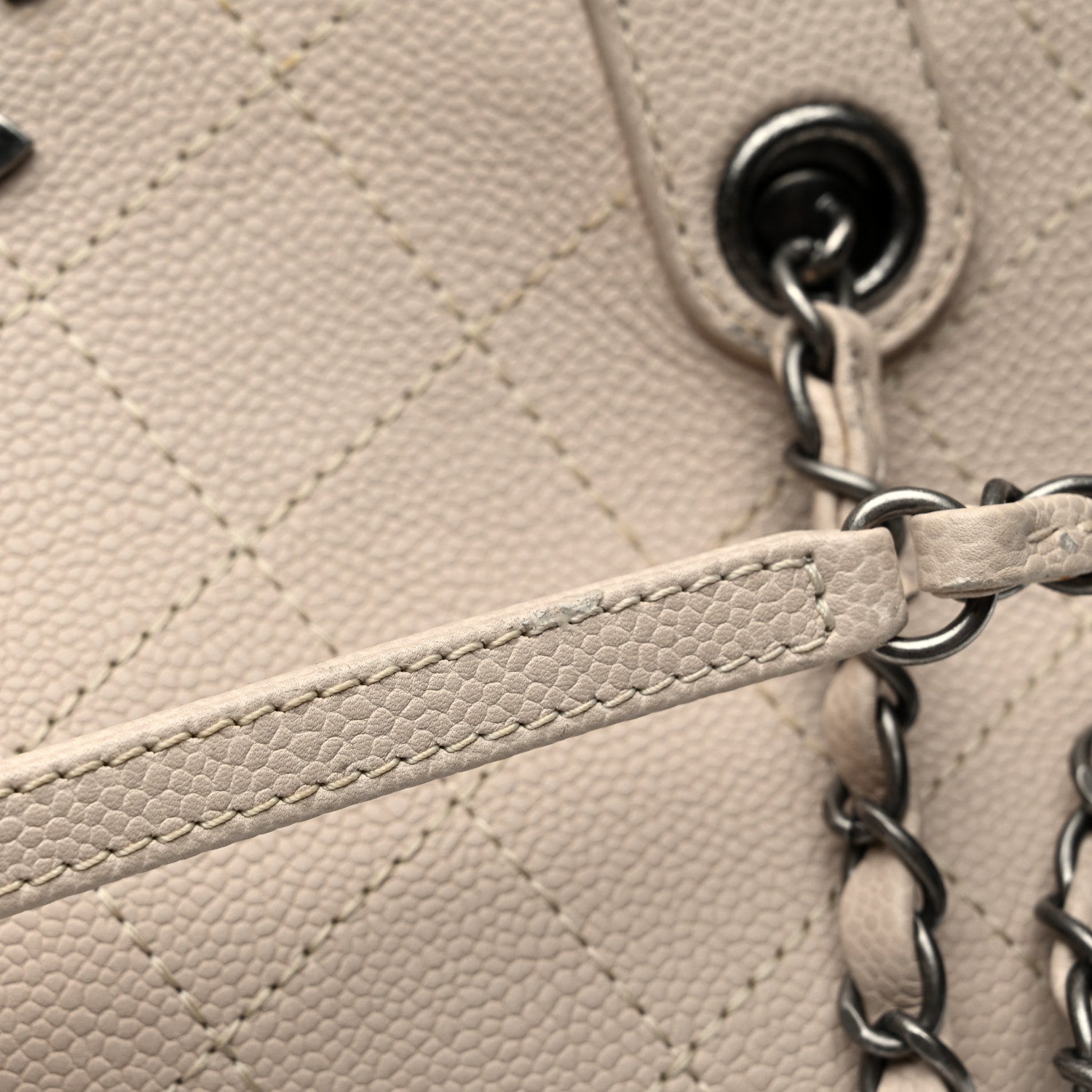 This is an authentic CHANEL Grained Vegetal Calfskin Urban Shopping Tote in Light Beige. This stylish tote is beautifully crafted of luxurious grained vegetal dyed stitched calfskin leather. The bag features rolled leather top handles and aged ruthenium chain link leather threaded shoulder straps. The top is open to a partitioned fabric interior with a central zipper compartment, patch pockets, and open compartments.Follow this item for alerts. Chanel is a registered trademark of Chanel. FASHIONPHILE is not affiliated with Chanel.