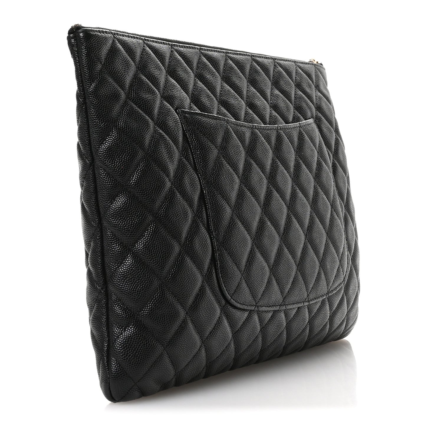 This is an authentic CHANEL Iridescent Caviar Quilted Large Cosmetic Case in Black. This cosmetic pouch is crafted of black iridescent diamond quilted caviar leather and gold hardware. The top opens to a black fabric interior with patch pockets.Follow this item for alerts. Chanel is a registered trademark of Chanel. FASHIONPHILE is not affiliated with Chanel.