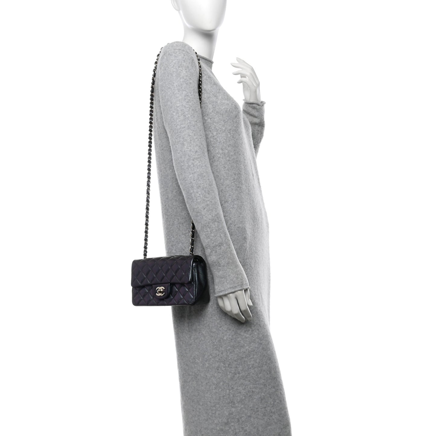 This is an authentic CHANEL Iridescent Lambskin Quilted Mini Rectangular Flap in Black. This chic mini crossbody classic is crafted of quilted lambskin leather in iridescent black. The bag features a gold chain link leather threaded shoulder strap and a gold classic CC turn lock. This opens the flap to a matching leather interior with zipper and patch pockets.Follow this item for alerts. Chanel is a registered trademark of Chanel. FASHIONPHILE is not affiliated with Chanel.