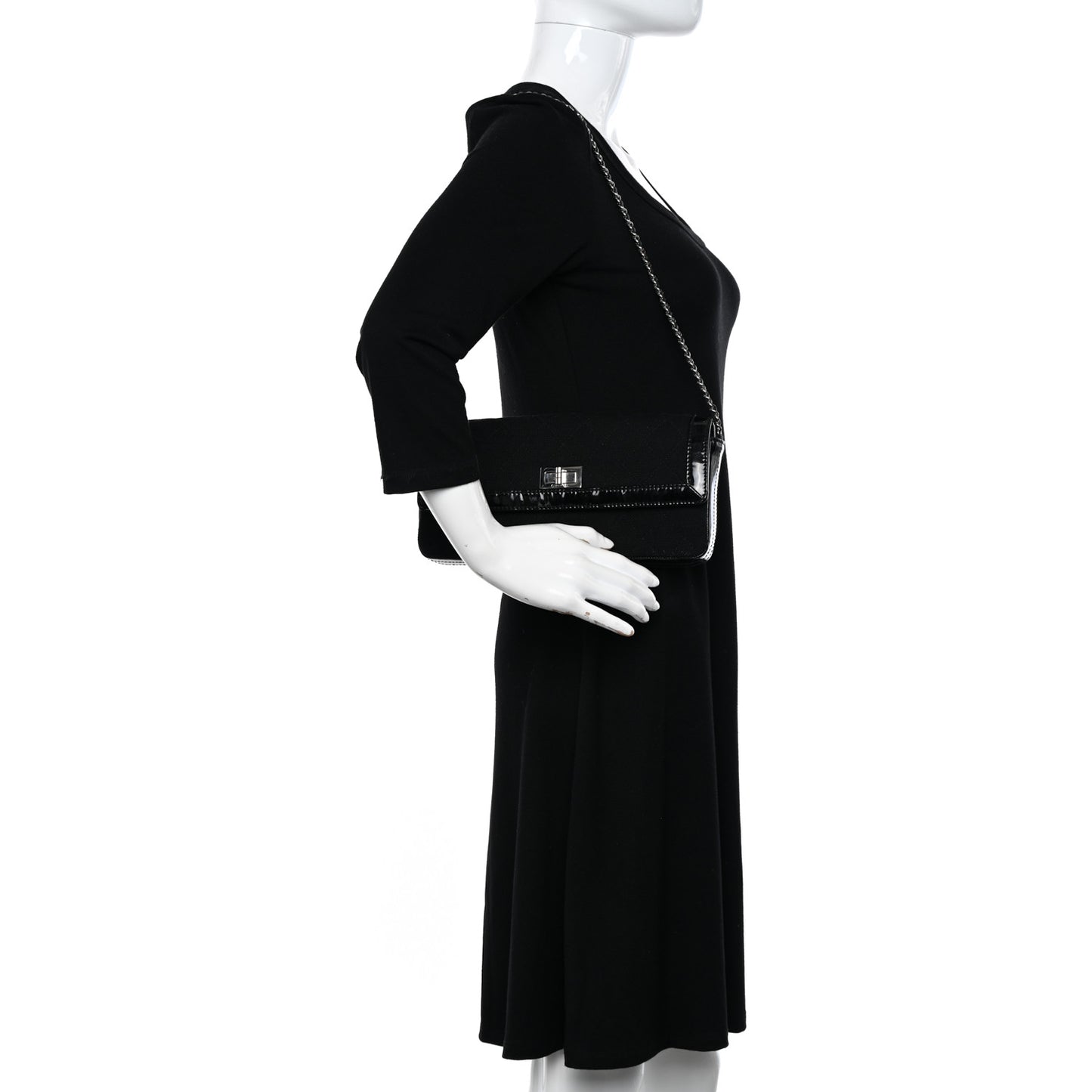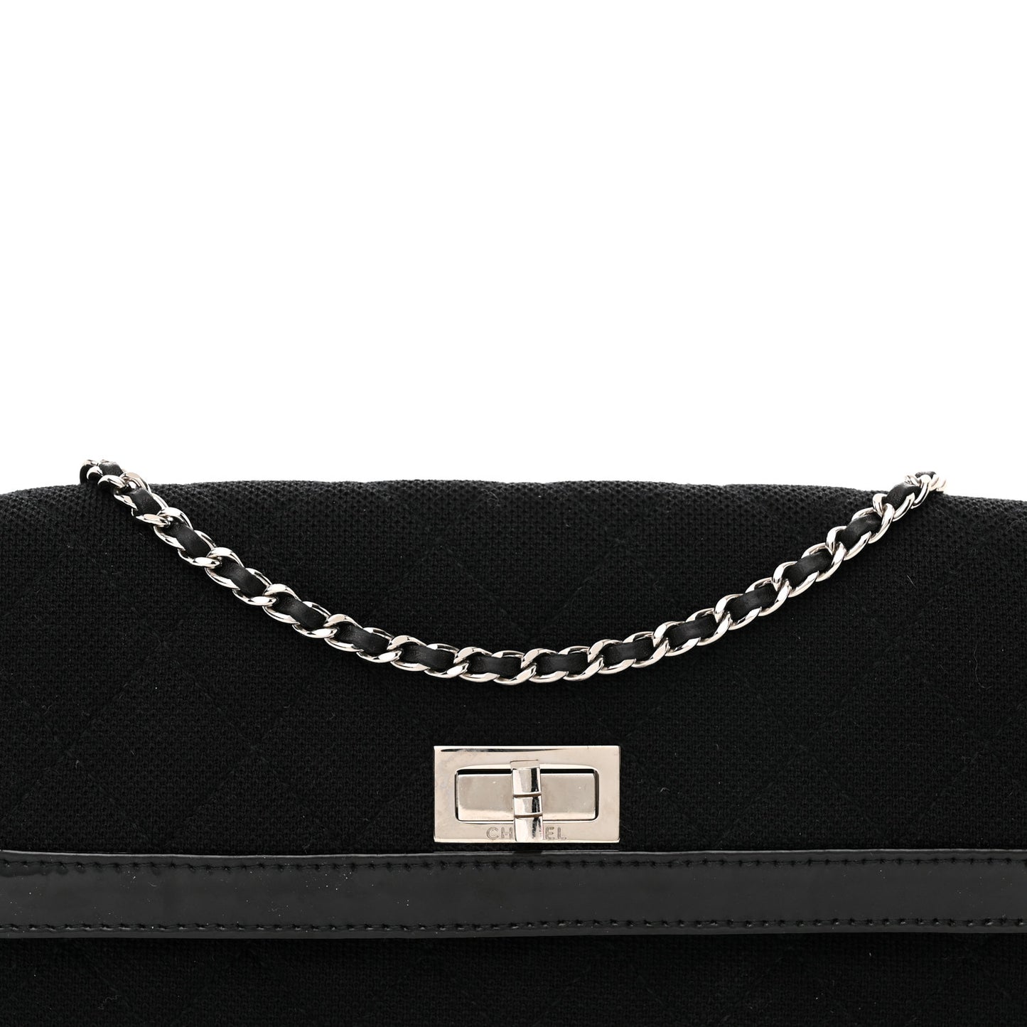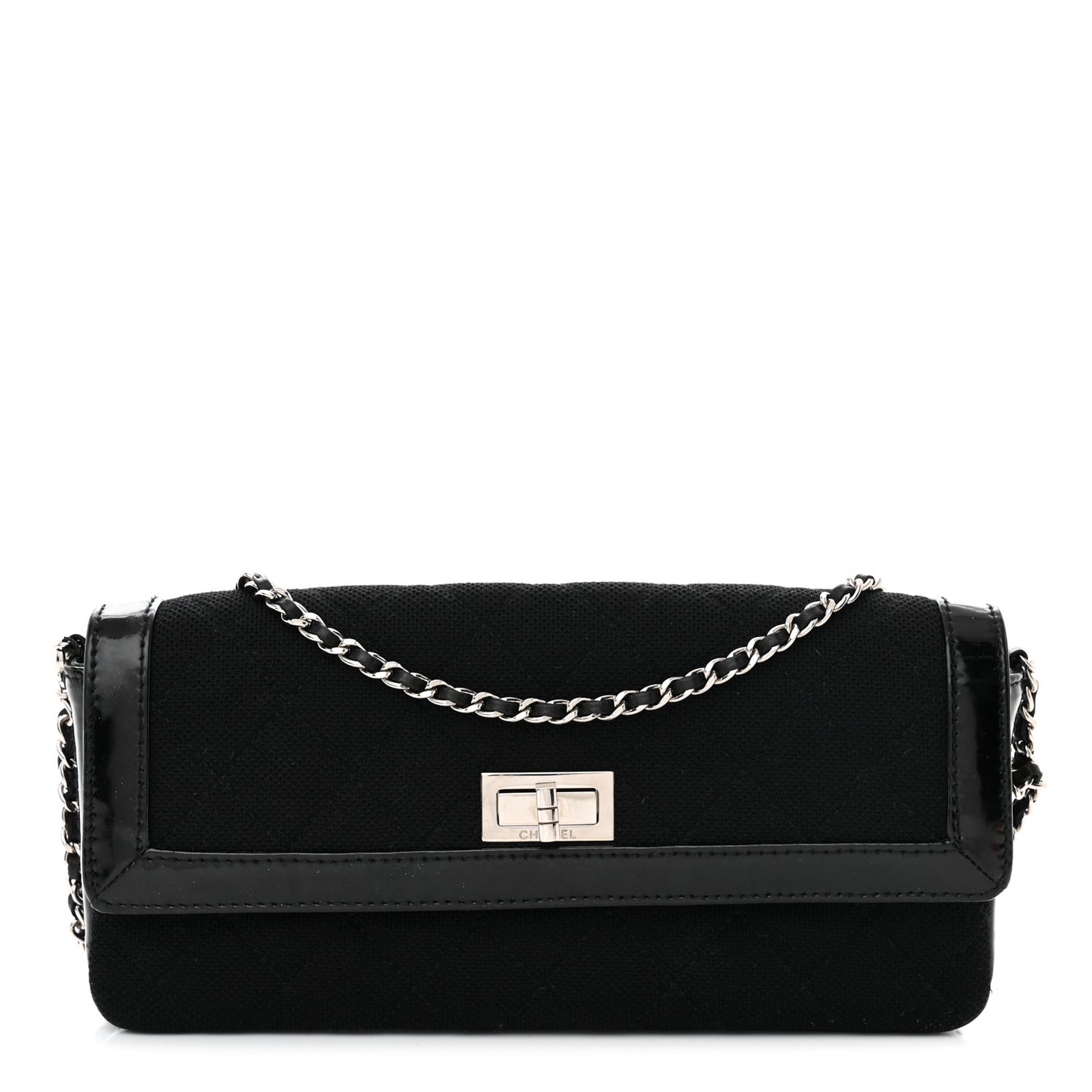 This is an authentic CHANEL Jersey Patent Quilted 2.55 Reissue East West Flap in Black. This classic clutch is crafted of luxurious black canvas with a patent leather trim. The bag features a leather threaded silver chain link shoulder strap and Chanel mademoiselle turn lock. The flap opens to a black leather interior with patch pockets.Follow this item for alerts. Chanel is a registered trademark of Chanel. FASHIONPHILE is not affiliated with Chanel.