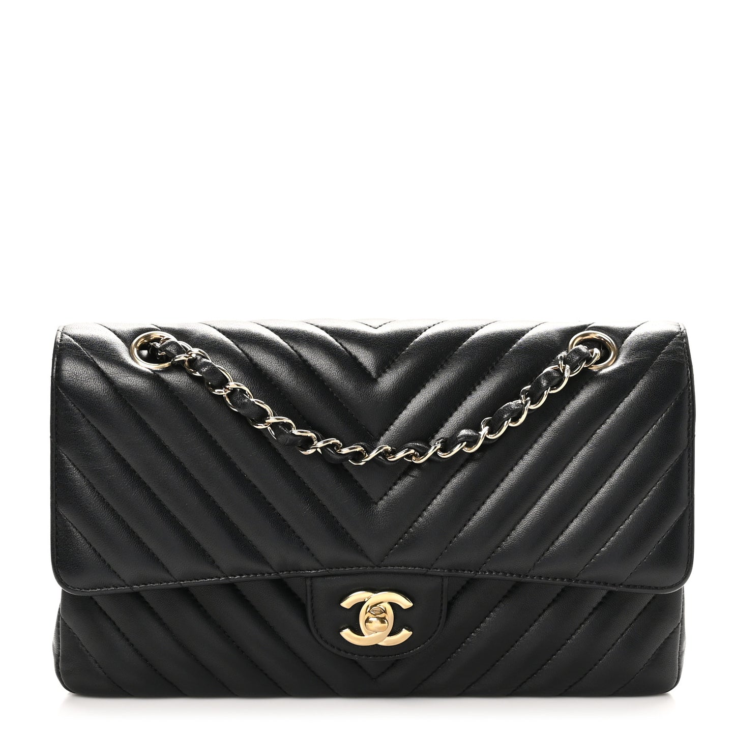 This is an authentic CHANEL Lambskin Chevron Quilted Medium Double Flap in Black. This stylish shoulder bag is crafted in black chevron-quilted lambskin leather. It features a gold chain link leather threaded shoulder strap, a front flap, and a matching gold Chanel CC turn lock. The flap reveals an inner flap and a black leather interior with patch pockets.Follow this item for alerts. Chanel is a registered trademark of Chanel. FASHIONPHILE is not affiliated with Chanel.