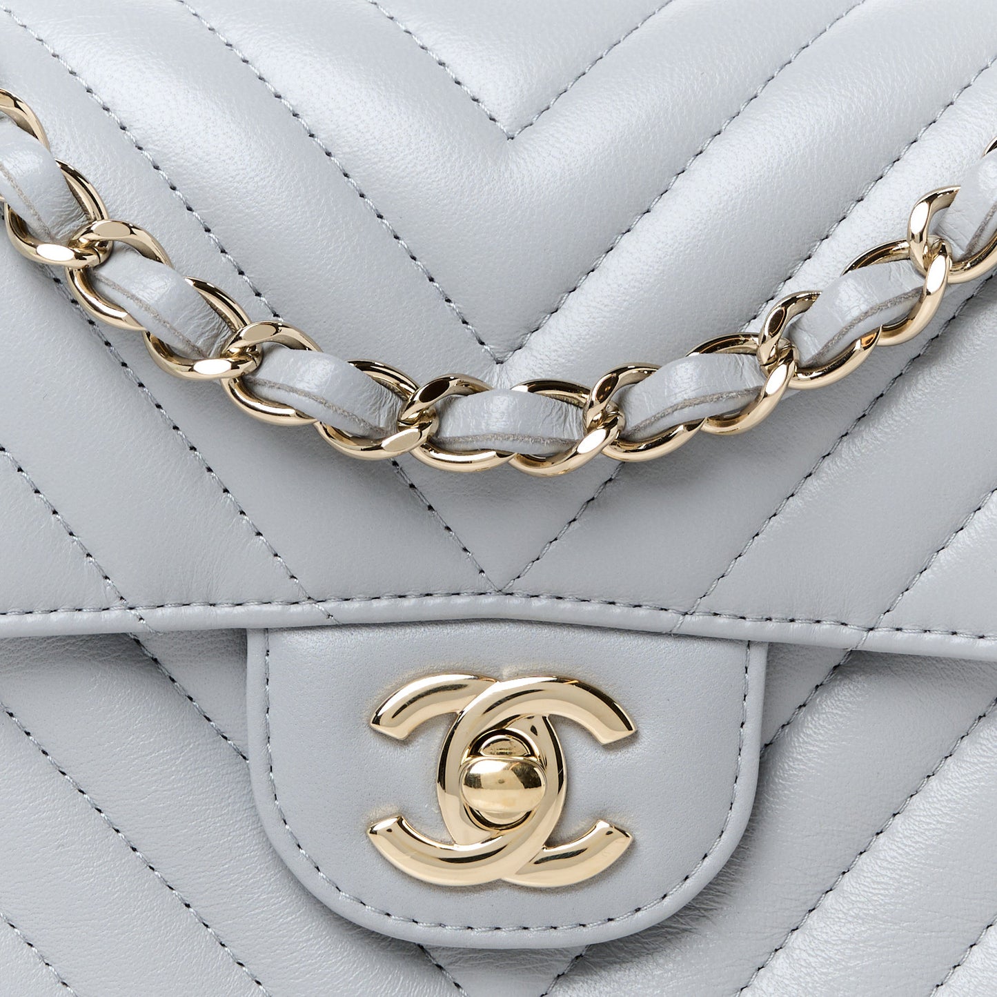 This is an authentic CHANEL Lambskin Chevron Quilted Mini Rectangular Flap in Grey. This bag is crafted of grey soft lambskin leather and gold hardware. The flap opens to a grey leather interior.Follow this item for alerts. Chanel is a registered trademark of Chanel. FASHIONPHILE is not affiliated with Chanel.