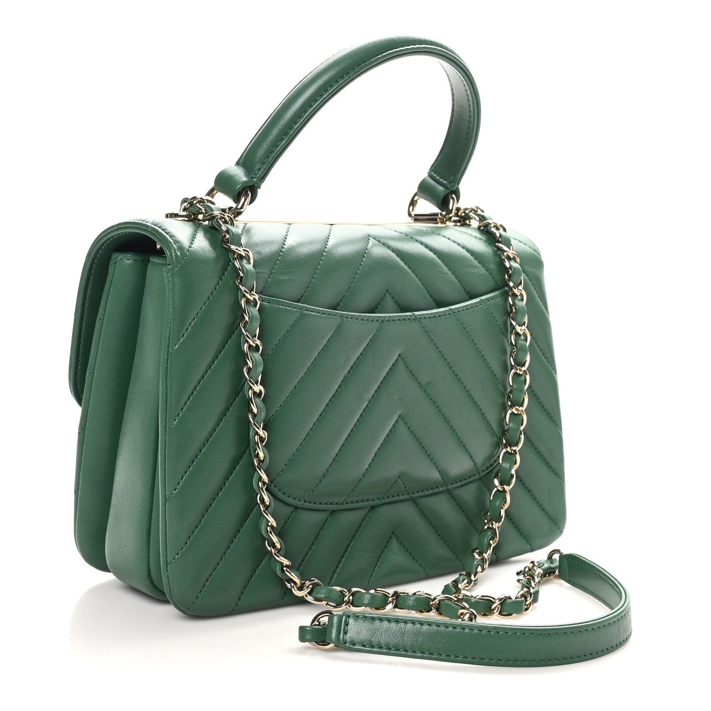 This is an authentic CHANEL Lambskin Chevron Quilted Small Trendy CC Dual Handle Flap Bag in Green. This stylish handbag is crafted of chevron-quilted lambskin leather in green. The bag features a reinforced leather top handle anchored to a Chanel logo engraved light gold bar, an optional light gold chain-link leather threaded shoulder strap, and a rear patch pocket. The crossover flap opens with a light gold CC turn-lock to a partitioned green leather interior with zipper and patch pockets.Follow this item for alerts. Chanel is a registered trademark of Chanel. FASHIONPHILE is not affiliated with Chanel.