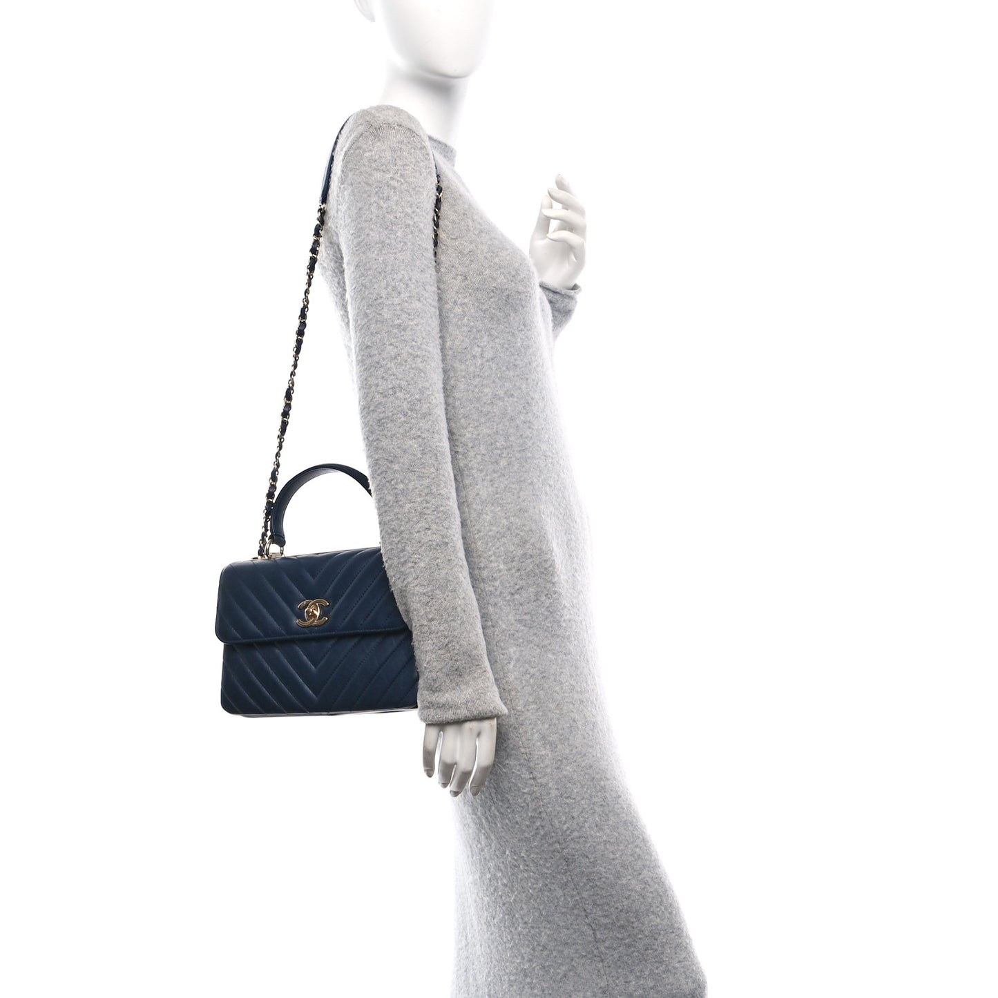 This is an authentic CHANEL Lambskin Chevron Quilted Small Trendy CC Flap Dual Handle Bag in Navy. This stylish handbag is crafted of diamond quilted lambskin leather in a dark blue. The refined bag features a leather top handle with gold links, a gold chain leather threaded shoulder strap with a shoulder pad, and a gold Chanel plate. The flap opens to a matching leather interior with a zipper and patch pockets.Follow this item for alerts. Chanel is a registered trademark of Chanel. FASHIONPHILE is not affiliated with Chanel.