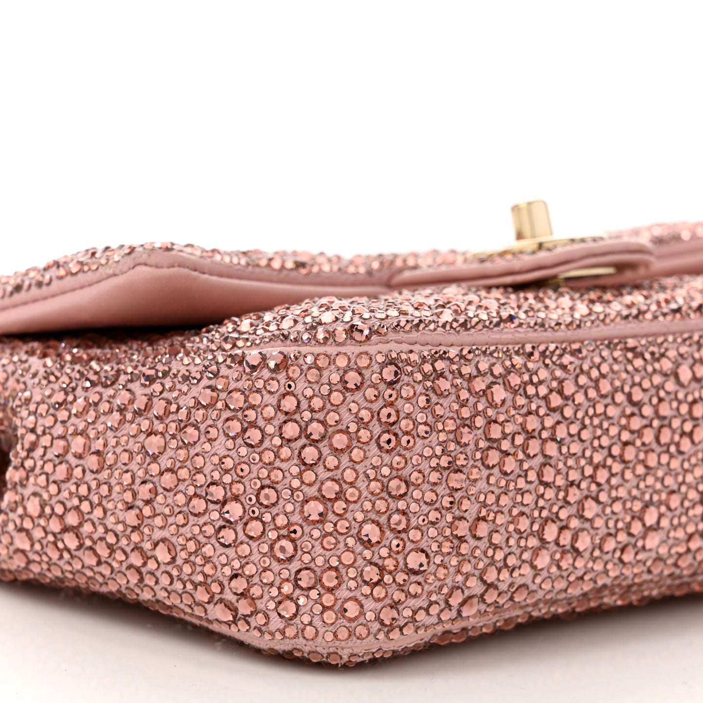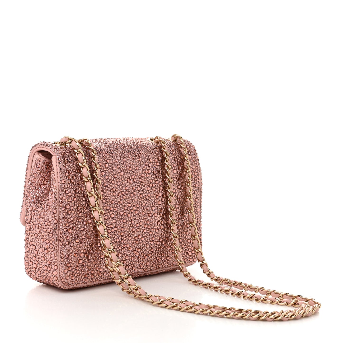This is an authentic CHANEL Lambskin Crystal Diamante Small Flap in Light Pink. This stylish bag is crafted of pink lambskin with matching shimmery crystals covering the exterior. This bag features a leather threaded gold chain shoulder strap and a gold CC turn lock. The front flap opens to a matching leather interior with a zipper pocket.Follow this item for alerts. Chanel is a registered trademark of Chanel. FASHIONPHILE is not affiliated with Chanel.
