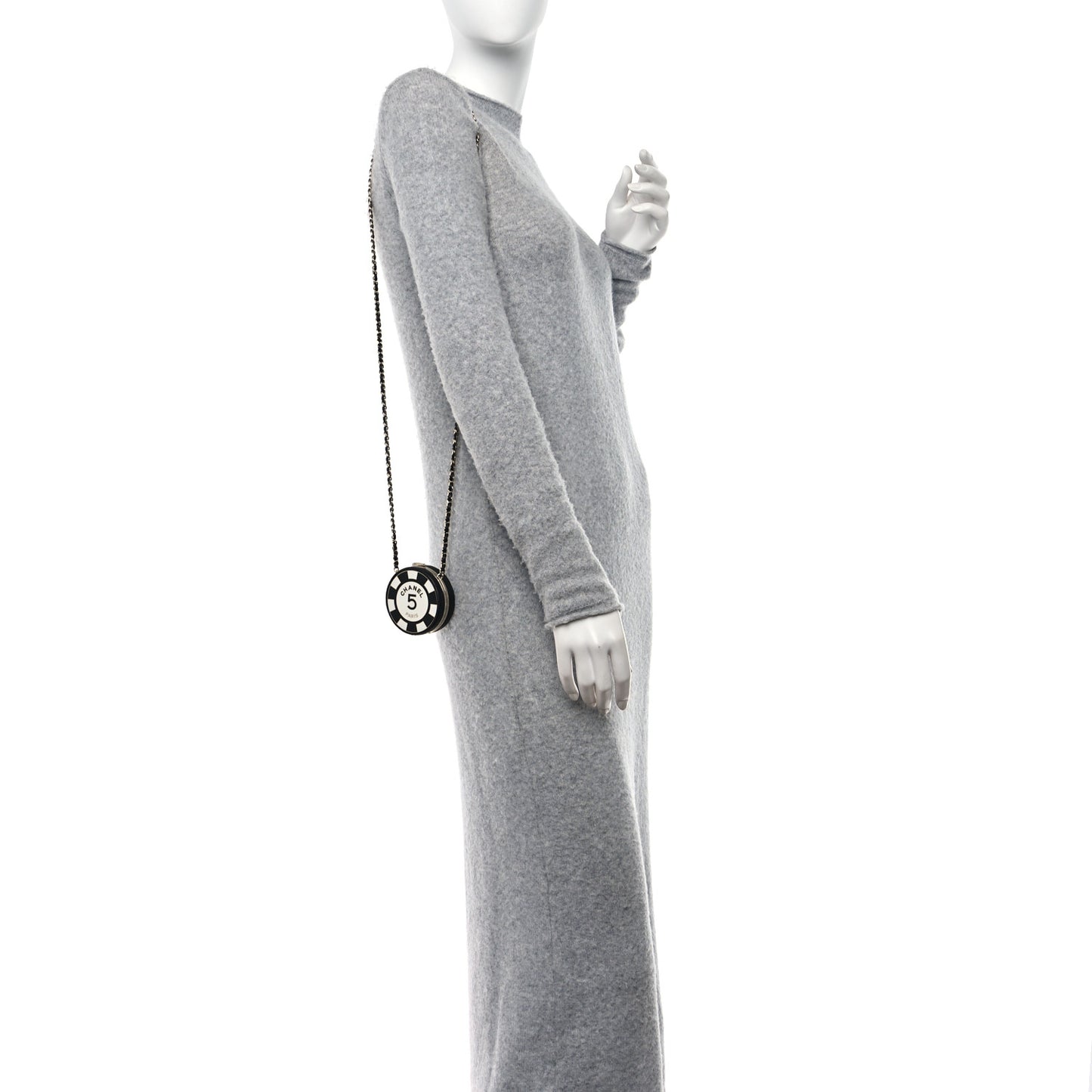 This is an authentic CHANEL Lambskin Enamel Quilted Round Poker Chip Clutch With Chain in Black and White. This show-stopping clutch is crafted of quilted black lambskin leather with an enamel "Chanel 5 Paris" logo on the front. The clutch features a leather threaded gold chain-link shoulder strap and a CC kiss-lock that opens the clutch to two mirrors.Follow this item for alerts. Chanel is a registered trademark of Chanel. FASHIONPHILE is not affiliated with Chanel.