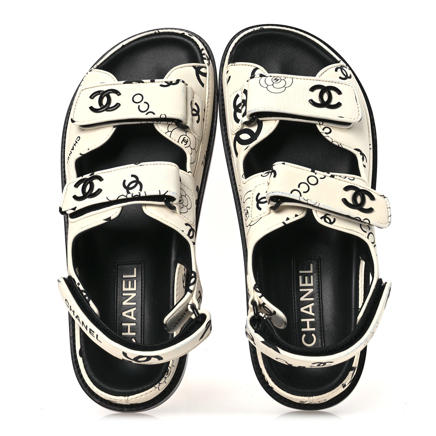 Chanel/ Accessories/ Shoes /Chanel Lambskin Printed CC Velcro Dad Sandals 37.5 White Black
