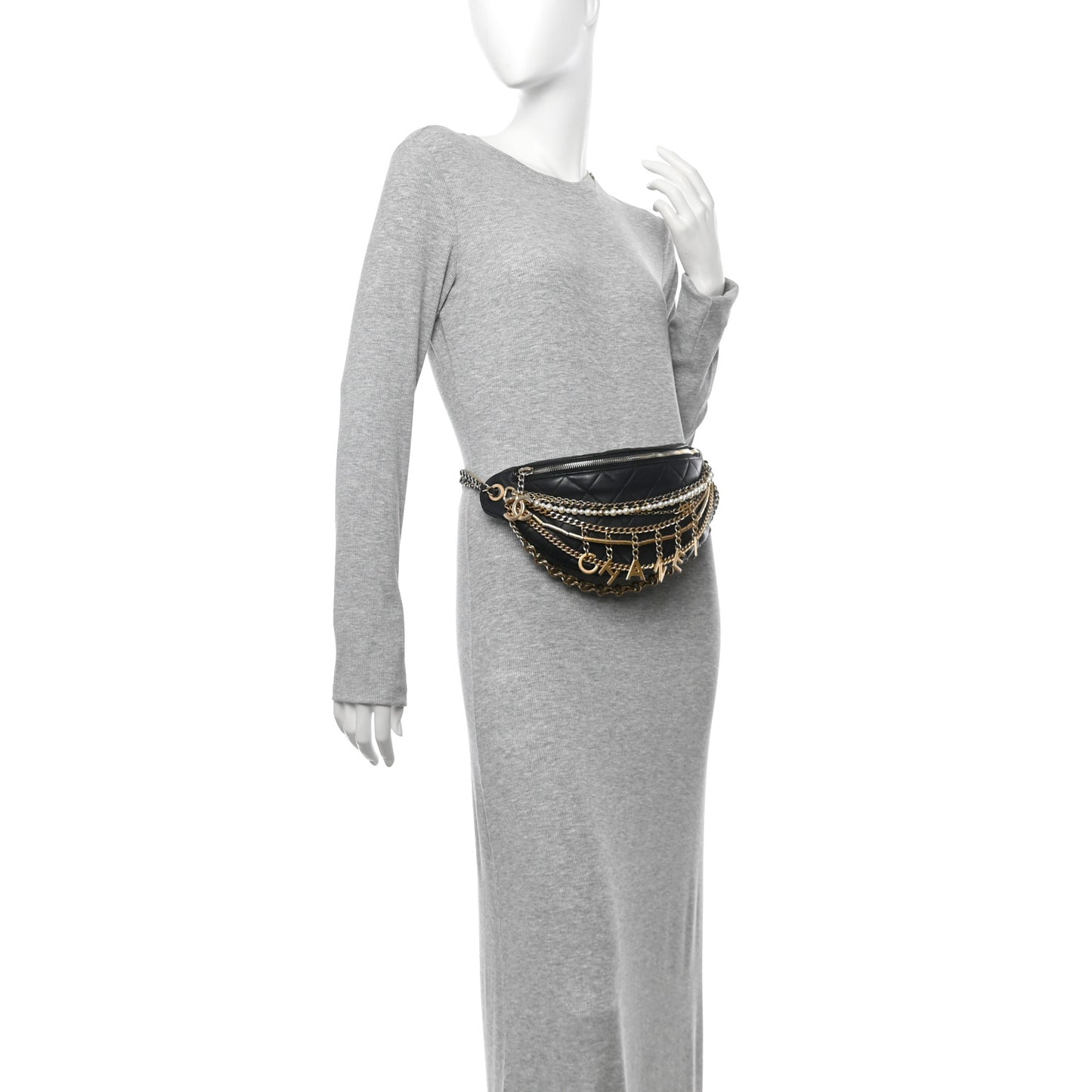 This is an authentic CHANEL Lambskin Quilted All About Chains Waist Belt Bag in Black. This stylish waist bag is finely crafted of diamond quilted black lambskin leather with multi strand aged gold and pearl strands with Chanel initials charms. The bag features an aged gold chain link and leather belt strap waist strap with adjustment links and a top zipper pocket with a Chanel CC zipper pull. This opens to gold leather interior with a zipper pocket.Follow this item for alerts. Chanel is a registered trademark of Chanel. FASHIONPHILE is not affiliated with Chanel.