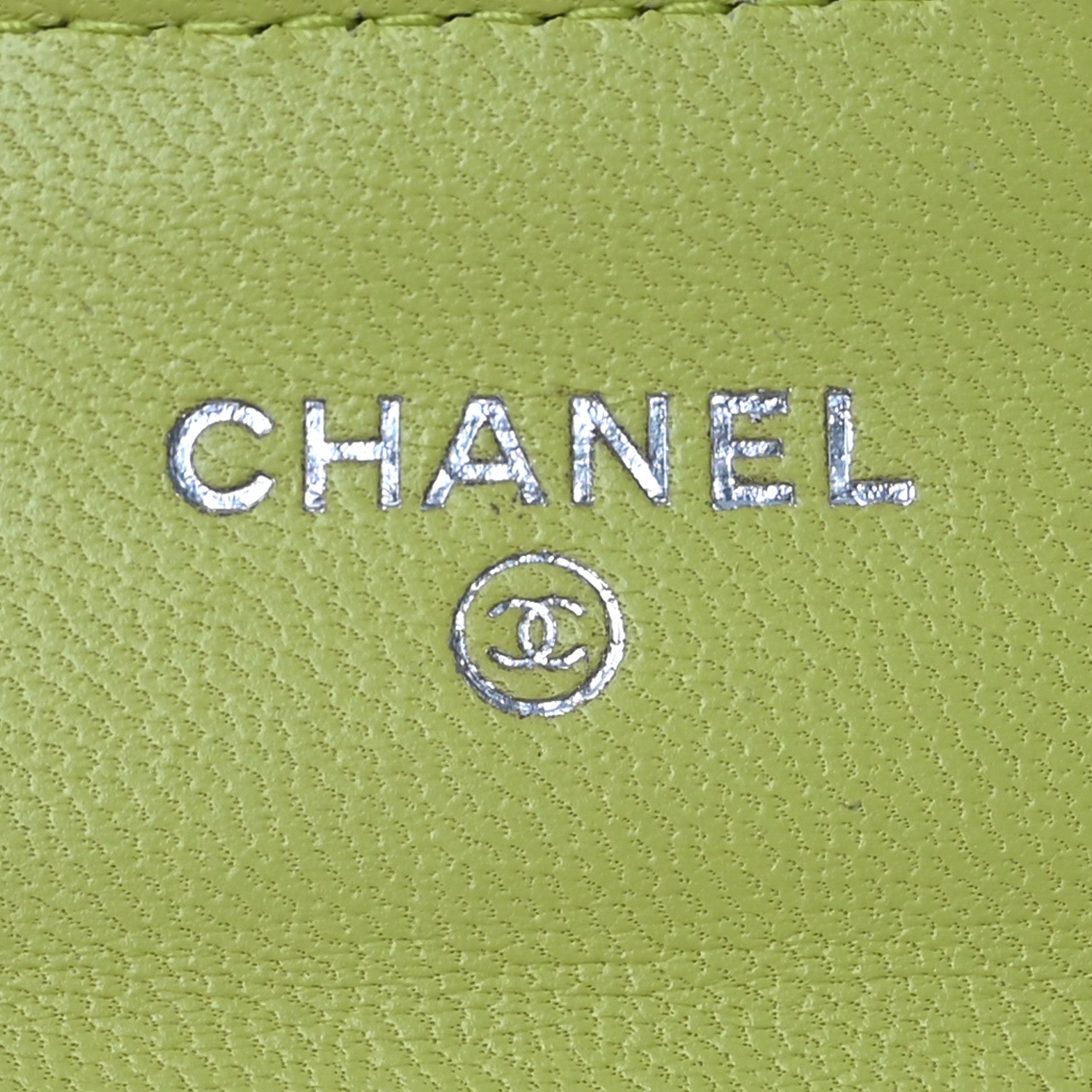 This is an authentic CHANEL Lambskin Quilted Flap Card Holder Wallet in Yellow. This cardholder is crafted of lime green lambskin leather with signature diamond quilting. It features a rear card slot and small silver-toned CC logo on the front. The flap unsnaps to a matching fabric interior with a front card slot.Follow this item for alerts. Chanel is a registered trademark of Chanel. FASHIONPHILE is not affiliated with Chanel.