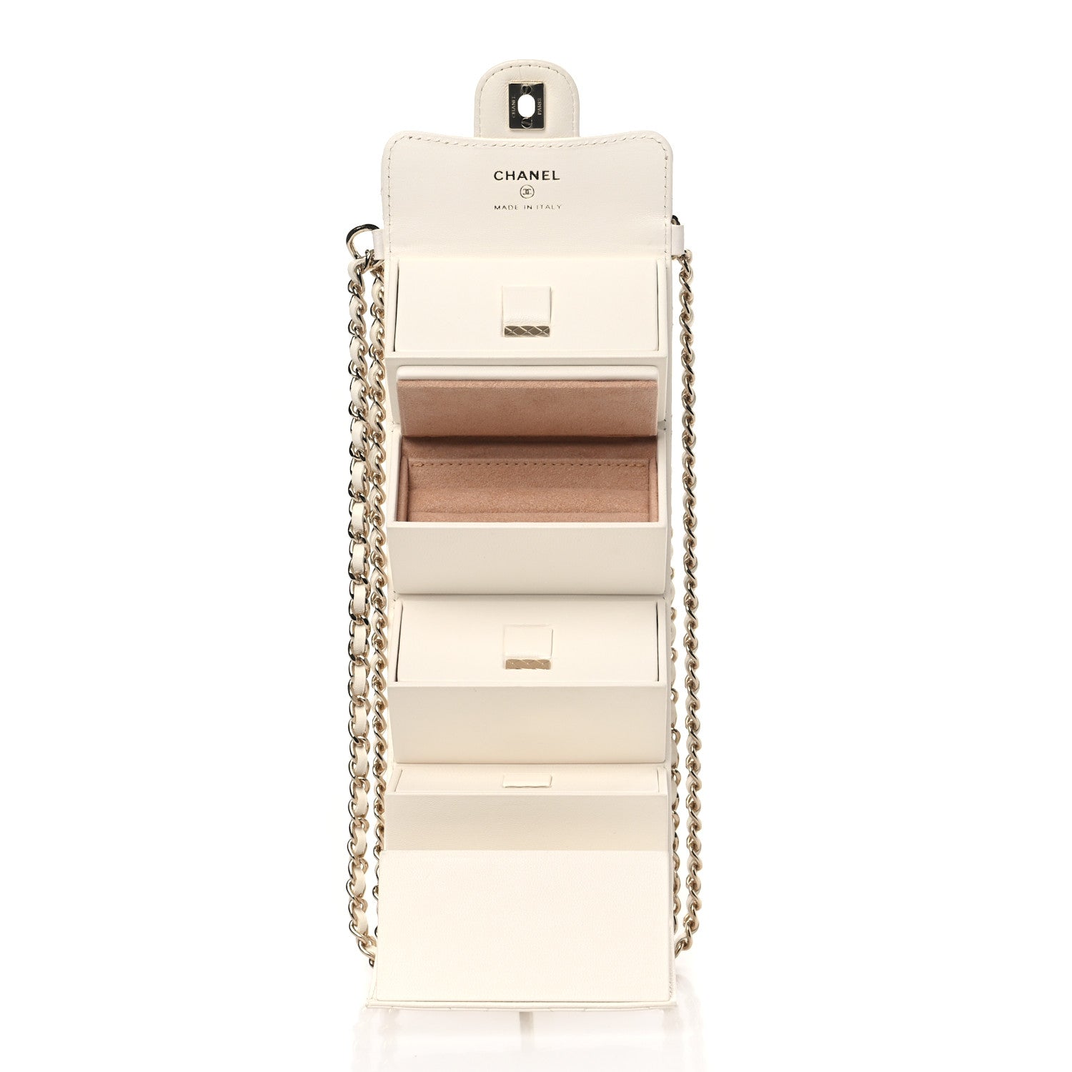 This is an authentic CHANEL Lambskin Quilted Foldable Jewelry Box With Chain in White. This mini clutch is crafted of luxurious diamond quilted lambskin leather in white. The bag features a polished gold chain link leather threaded shoulder strap and a polished gold Chanel CC logo on the flap.Follow this item for alerts. Chanel is a registered trademark of Chanel. FASHIONPHILE is not affiliated with Chanel.