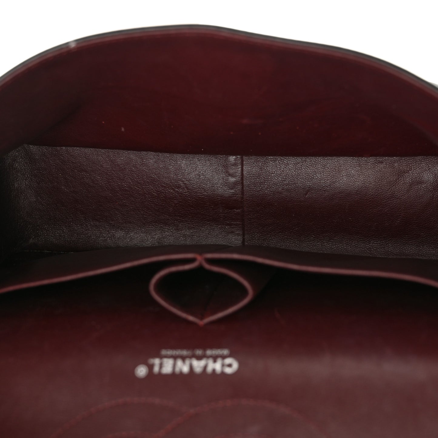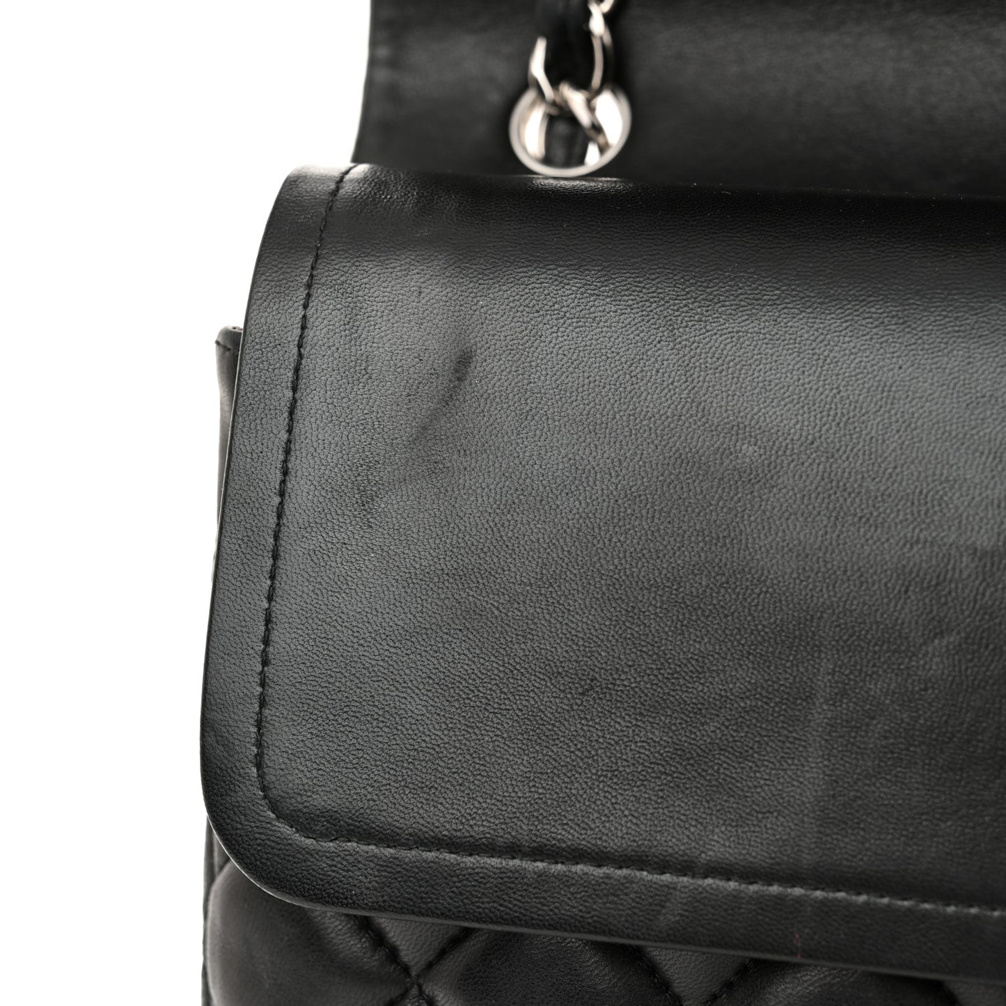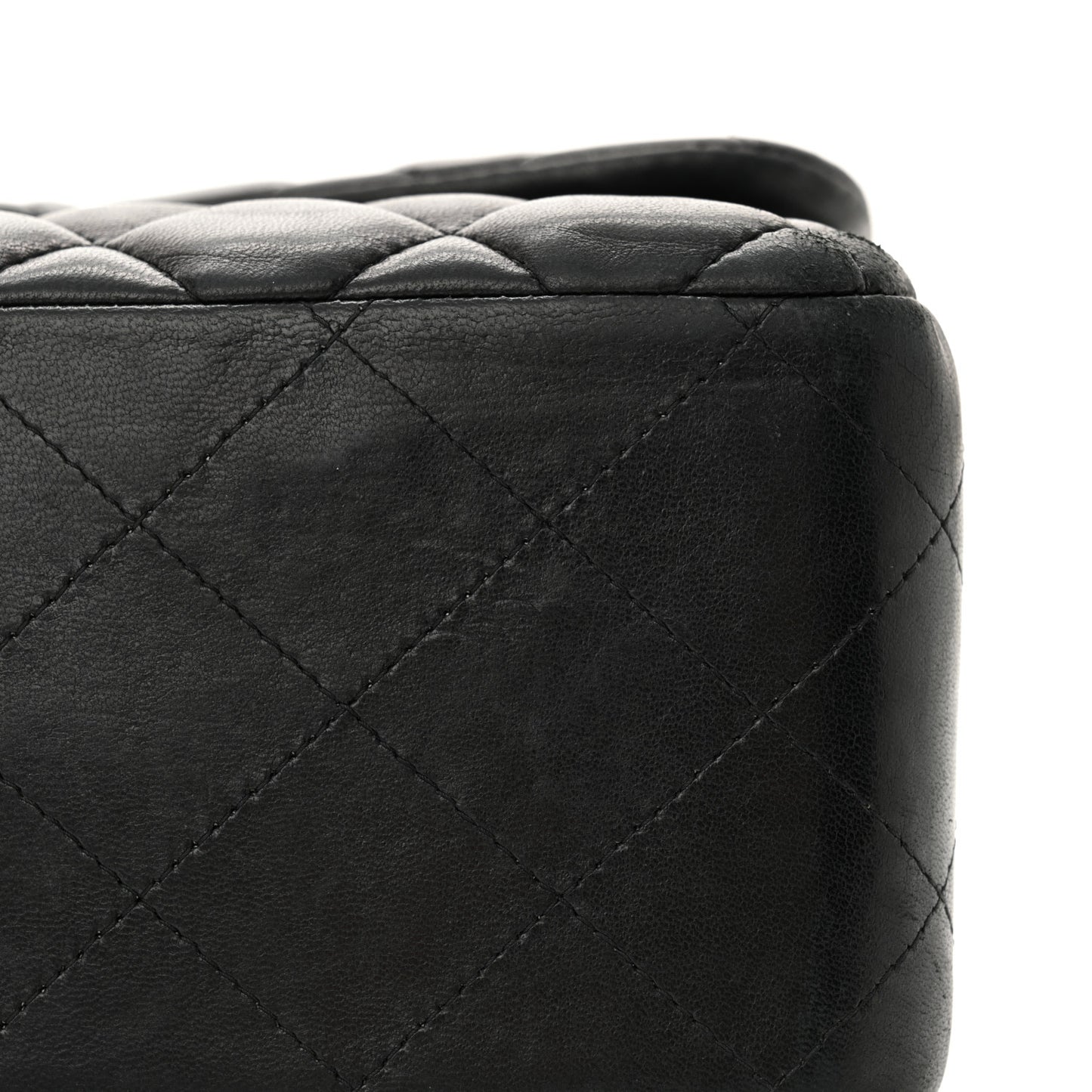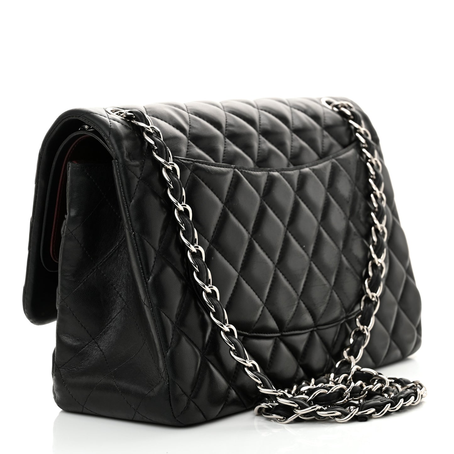 This is an authentic CHANEL Lambskin Quilted Jumbo Double Flap in Black. This bag is crafted of soft and supple diamond-quilted lambskin leather in black. It features a leather-threaded polished silver chain-link shoulder strap, a rear patch pocket, and a matching silver classic CC turn-lock on the crossover flap. This opens the bag to reveal an inner flap and a burgundy leather interior with two patch pockets.Follow this item for alerts. Chanel is a registered trademark of Chanel. FASHIONPHILE is not affiliated with Chanel.