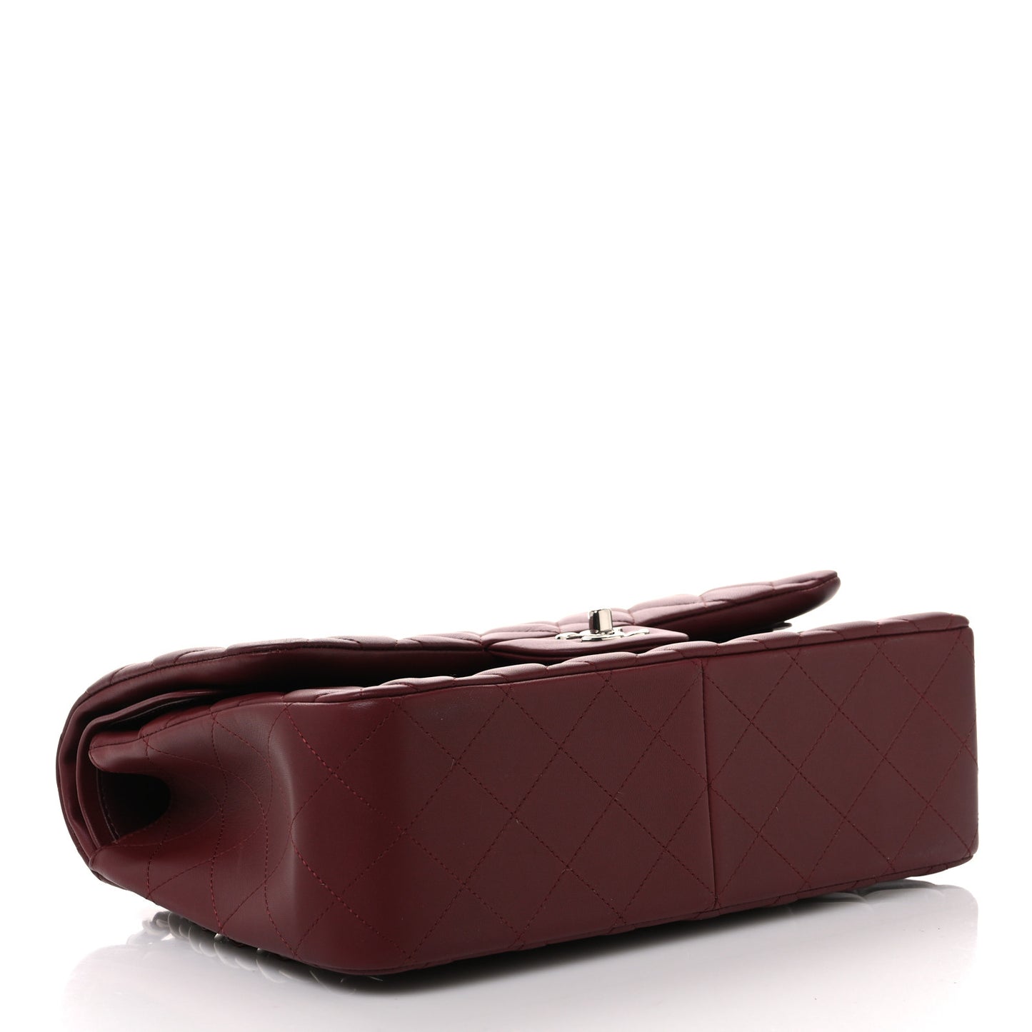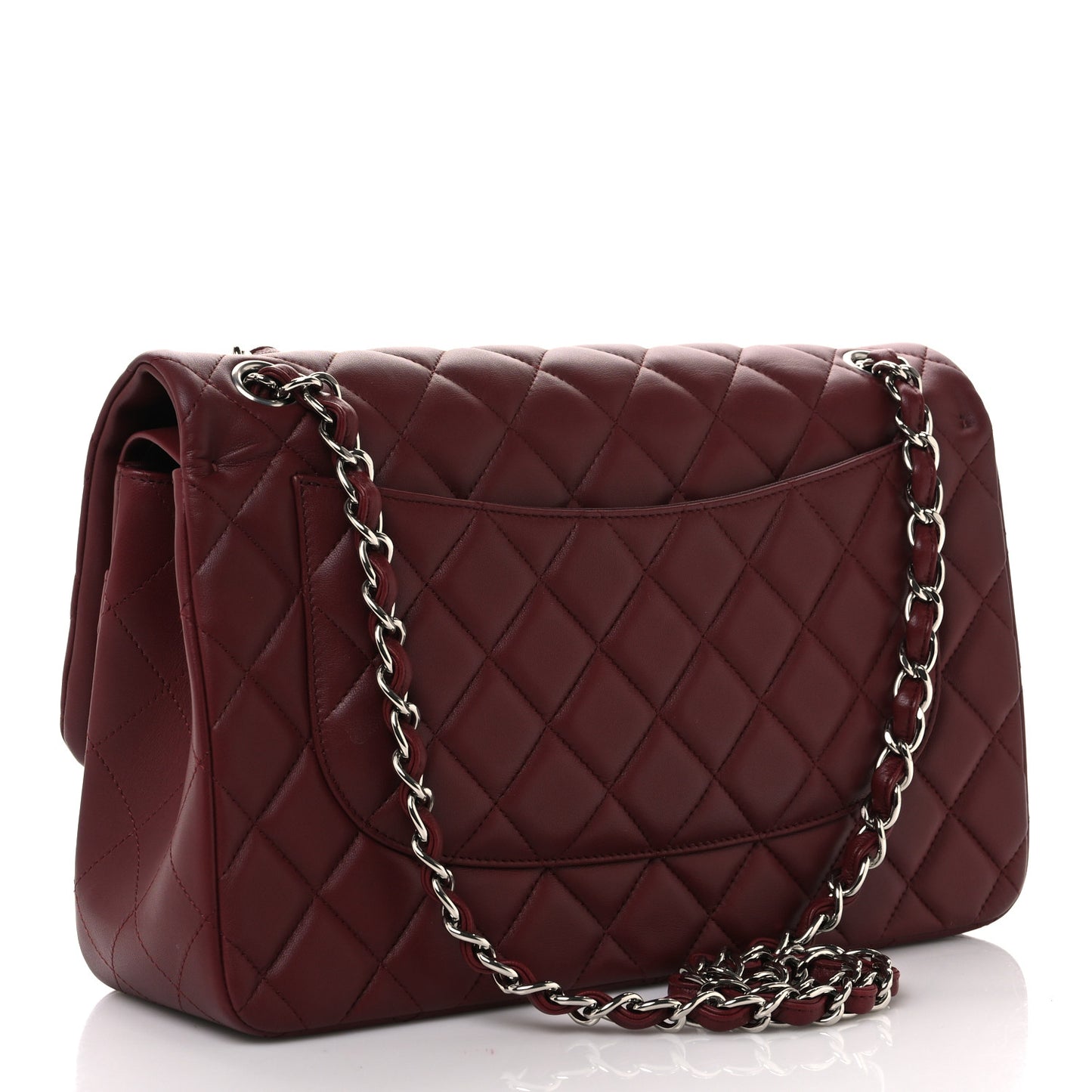 This is an authentic CHANEL Lambskin Quilted Jumbo Double Flap in Burgundy. This classic flap shoulder bag is crafted of soft diamond quilted lambskin leather in deep red. The bag features a silver chain-link leather threaded shoulder strap, a rear pocket, and a silver Chanel CC turn lock. This opens the flap to reveal an inner flap and a matching red leather interior with patch pockets.Follow this item for alerts. Chanel is a registered trademark of Chanel. FASHIONPHILE is not affiliated with Chanel.
