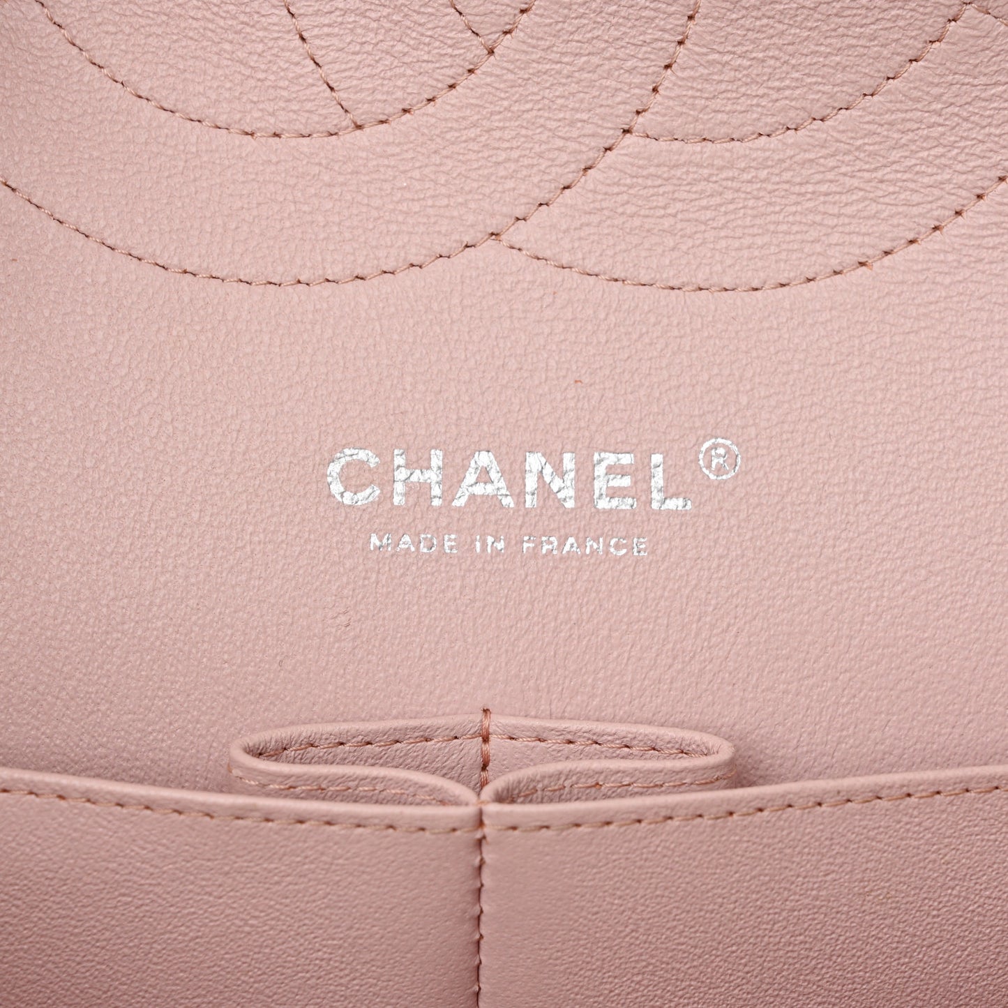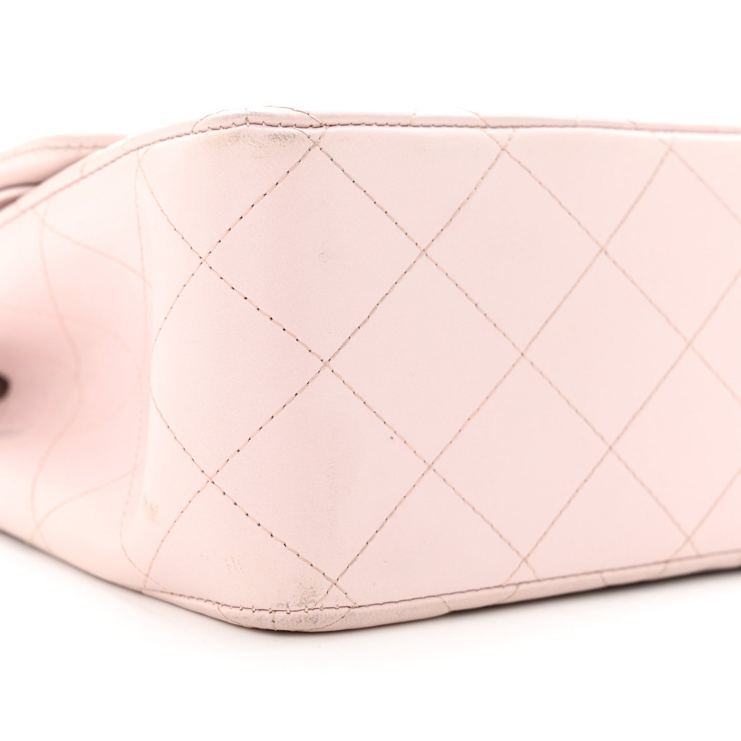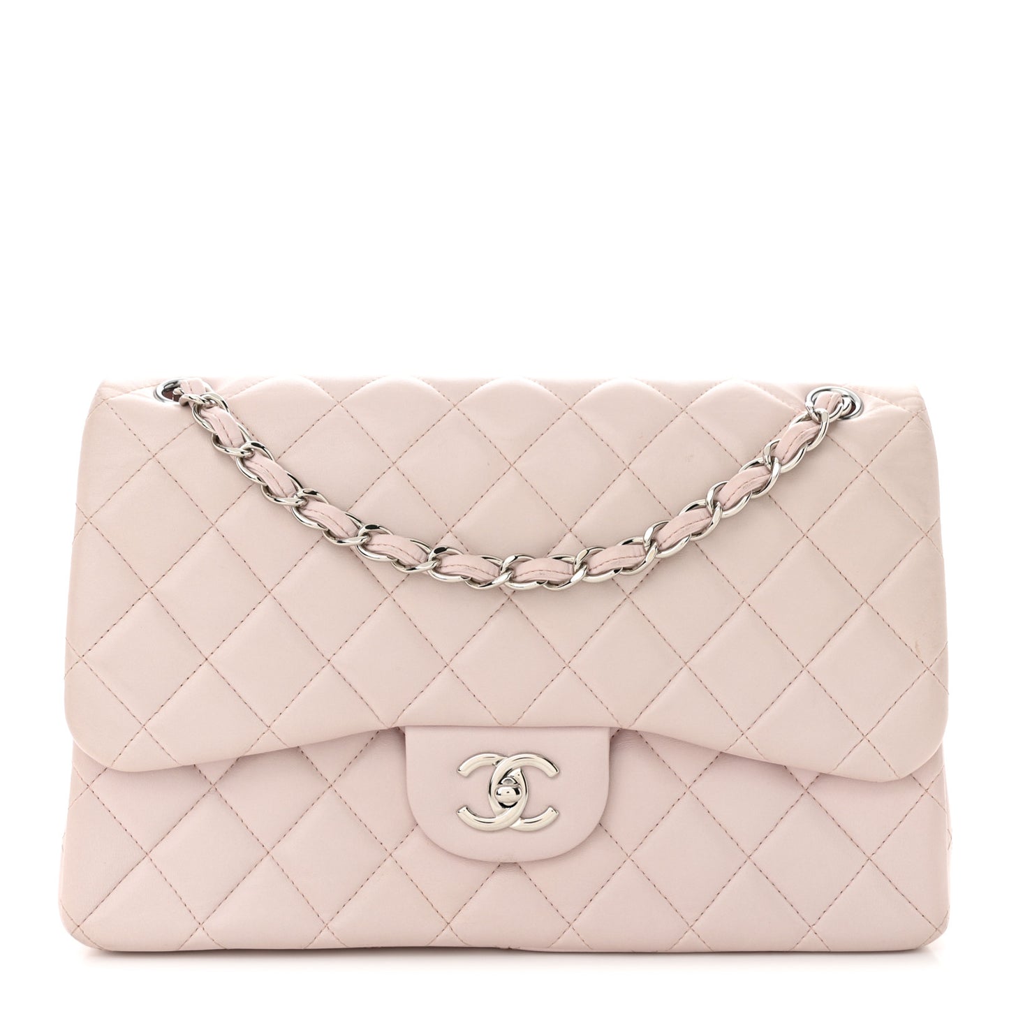This is an authentic CHANEL Lambskin Quilted Jumbo Double Flap in Light Pink. This handbag is crafted of diamond quilted lambskin leather in light pink. The shoulder bag features a leather threaded silver chain link shoulder strap and a silver Chanel CC turn lock. The flap opens to a matching leather interior with an inner flap and pockets.Follow this item for alerts. Chanel is a registered trademark of Chanel. FASHIONPHILE is not affiliated with Chanel.