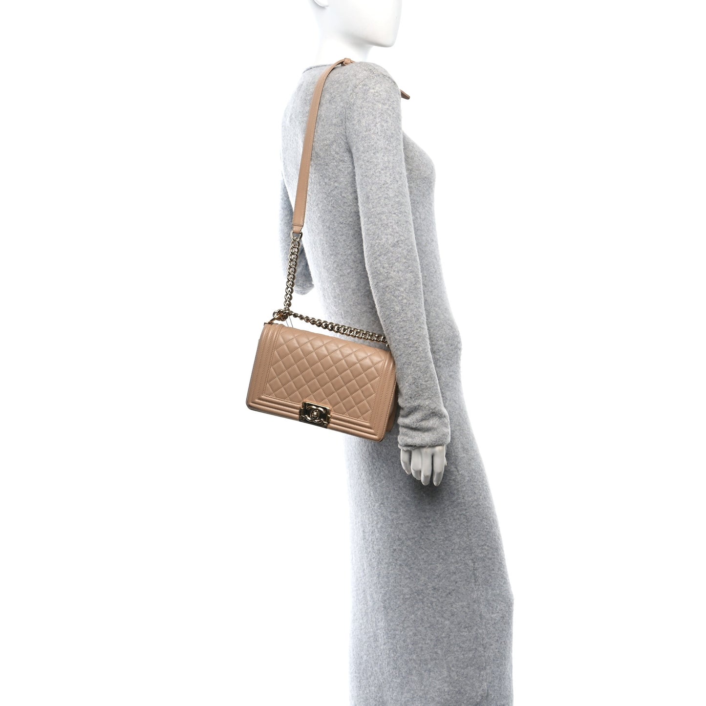 This is an authentic CHANEL Lambskin Quilted Medium Boy Flap in Beige. This chic shoulder bag is crafted of luxuriously textured diamond quilted leather in beige. The bag features a polished gold chain-link shoulder strap, and a matching polished gold boy CC press lock on the crossover flap. This opens the bag to a fabric interior with a patch pocket.Follow this item for alerts. Chanel is a registered trademark of Chanel. FASHIONPHILE is not affiliated with Chanel.