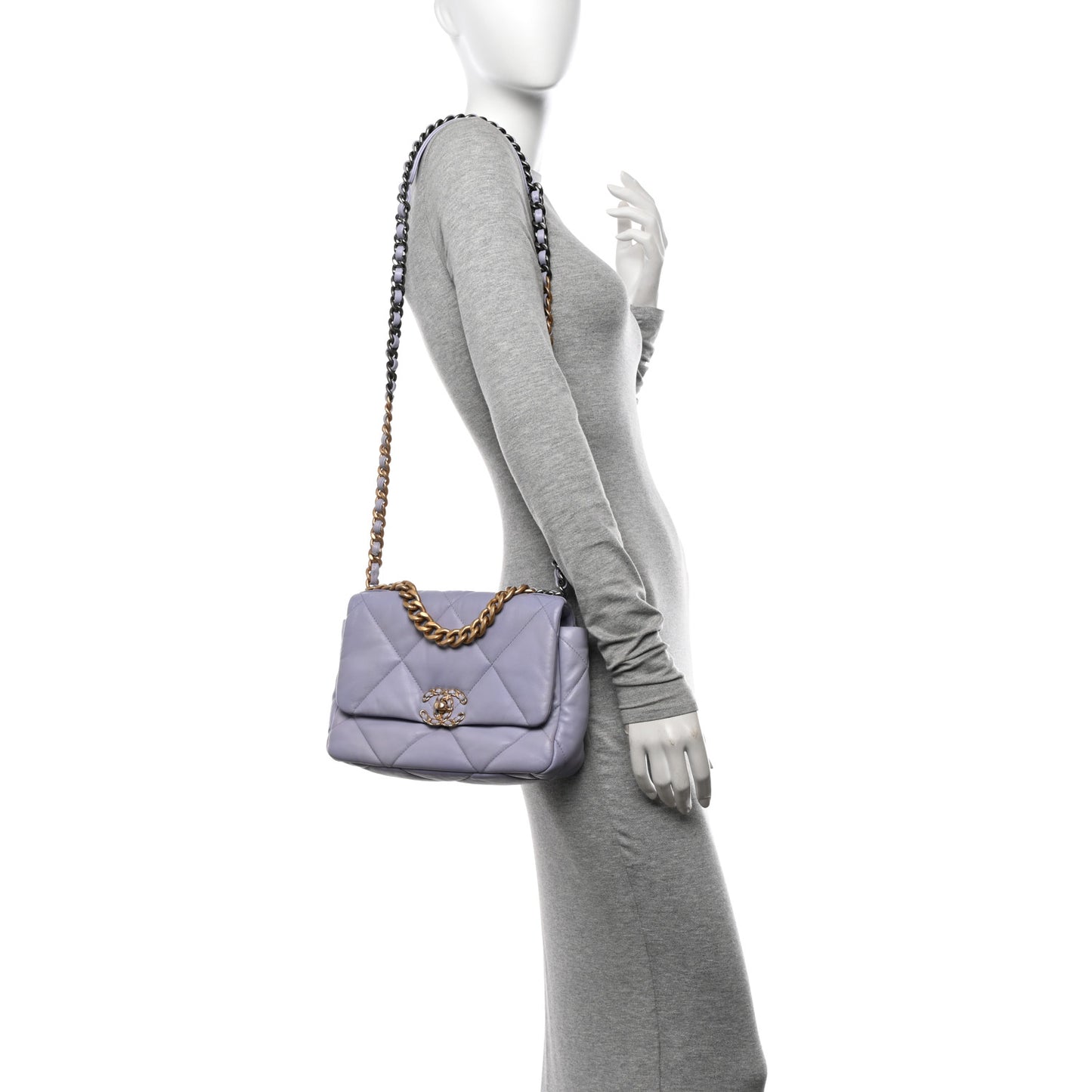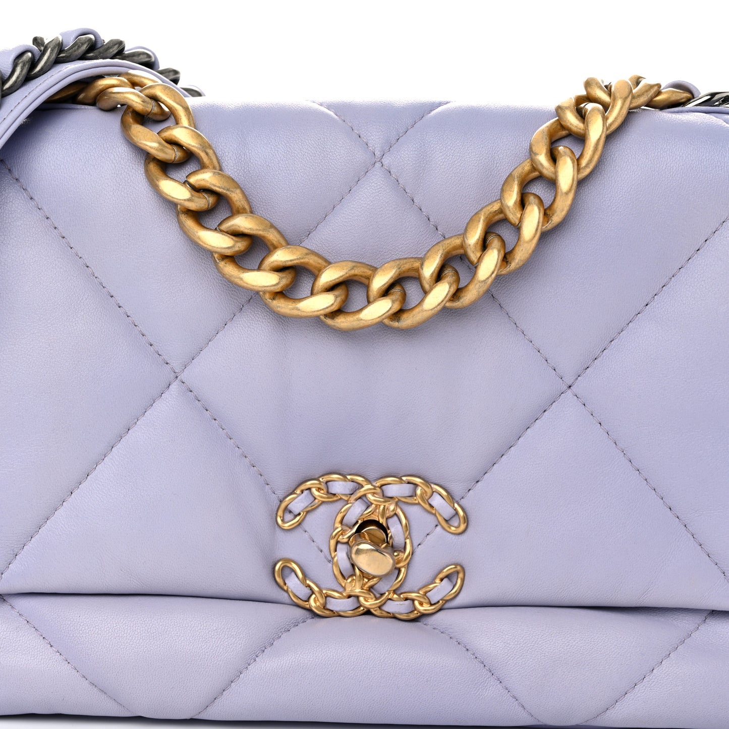 This is an authentic CHANEL Lambskin Quilted Medium Chanel 19 Flap in Light Purple. This pillowy soft shoulder bag is crafted of oversized quilted lambskin leather in purple. The bag features an aged chain detail CC turn-lock on the flap, a magnetic snap pocket at the rear, and a leather threaded aged gold, ruthenium, and dark silver chain-link shoulder strap with a leather shoulder pad. The front flap opens to a matching fabric interior with a zipper pocket.Follow this item for alerts. Chanel is a registered trademark of Chanel. FASHIONPHILE is not affiliated with Chanel.