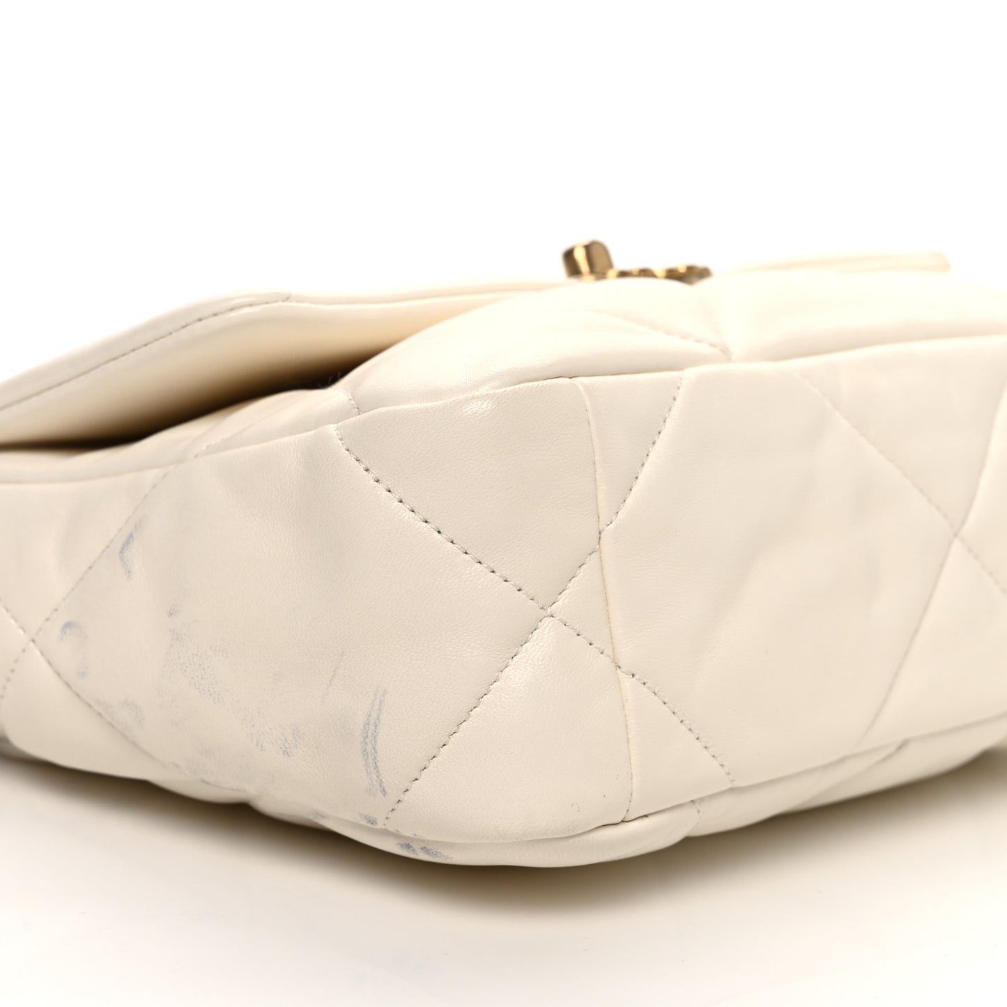 This is an authentic CHANEL Lambskin Quilted Medium Chanel 19 Flap in White. This pillowy soft shoulder bag is crafted of quilted lambskin leather in white. It features an aged gold chain detail CC turn-lock on the flap, a magnetic snap pocket at the rear, and a leather threaded silver, ruthenium, and gold chain-link strap with a leather shoulder pad. The front flap opens to a red fabric interior with a zipper pocket.Follow this item for alerts. Chanel is a registered trademark of Chanel. FASHIONPHILE is not affiliated with Chanel.