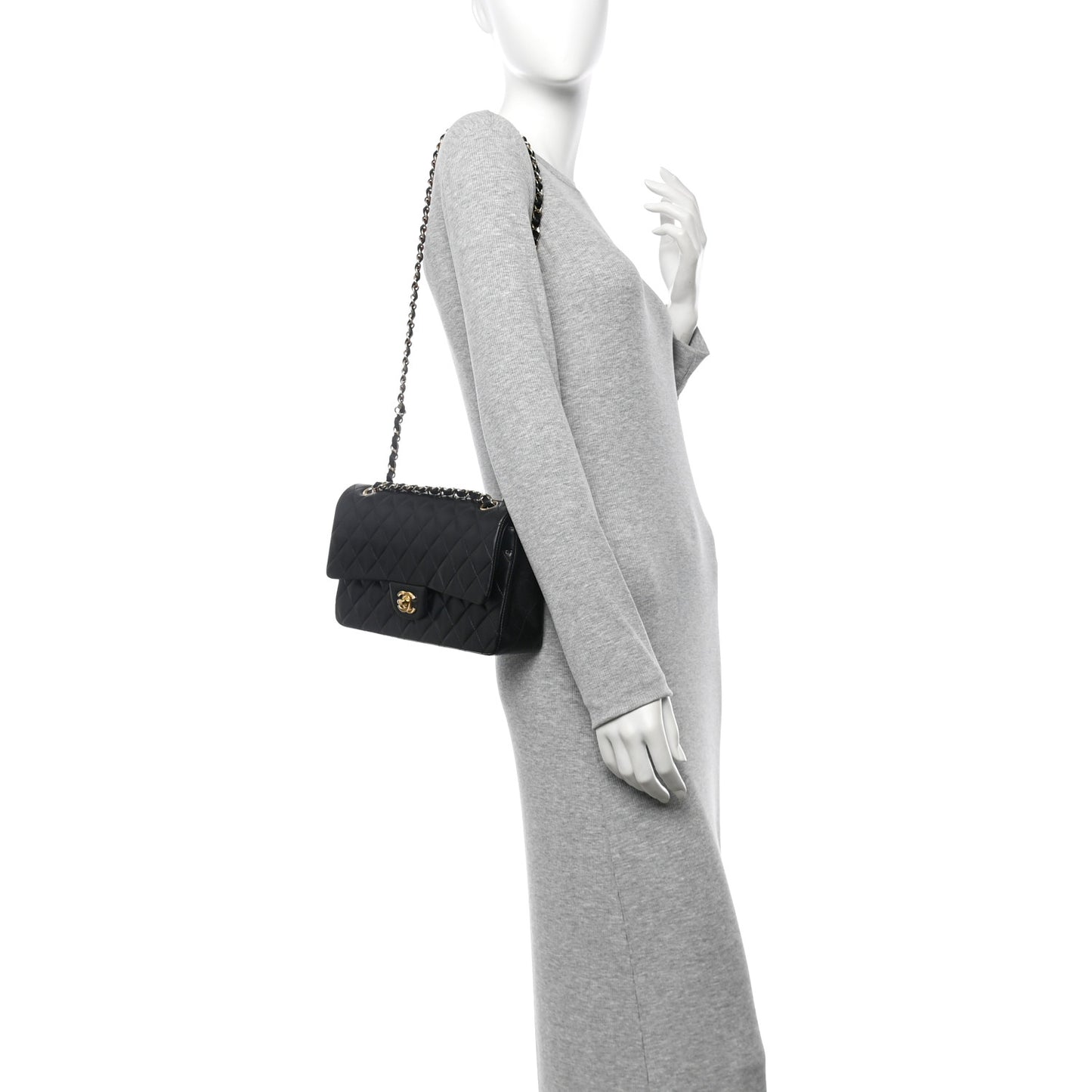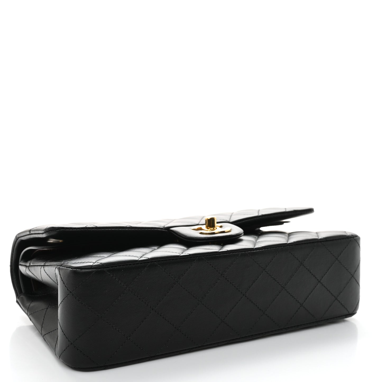 This is an authentic CHANEL Lambskin Quilted Medium Double Flap in Black. This chic shoulder bag is crafted of diamond-quilted lambskin leather in black. The bag features a rear flat pocket, a leather-threaded polished silver chain link shoulder strap, and a silver classic CC turn lock on the front flap. This lock opens the bag to an inner flap and smooth burgundy leather interior with patch pockets.Follow this item for alerts. Chanel is a registered trademark of Chanel. FASHIONPHILE is not affiliated with Chanel.