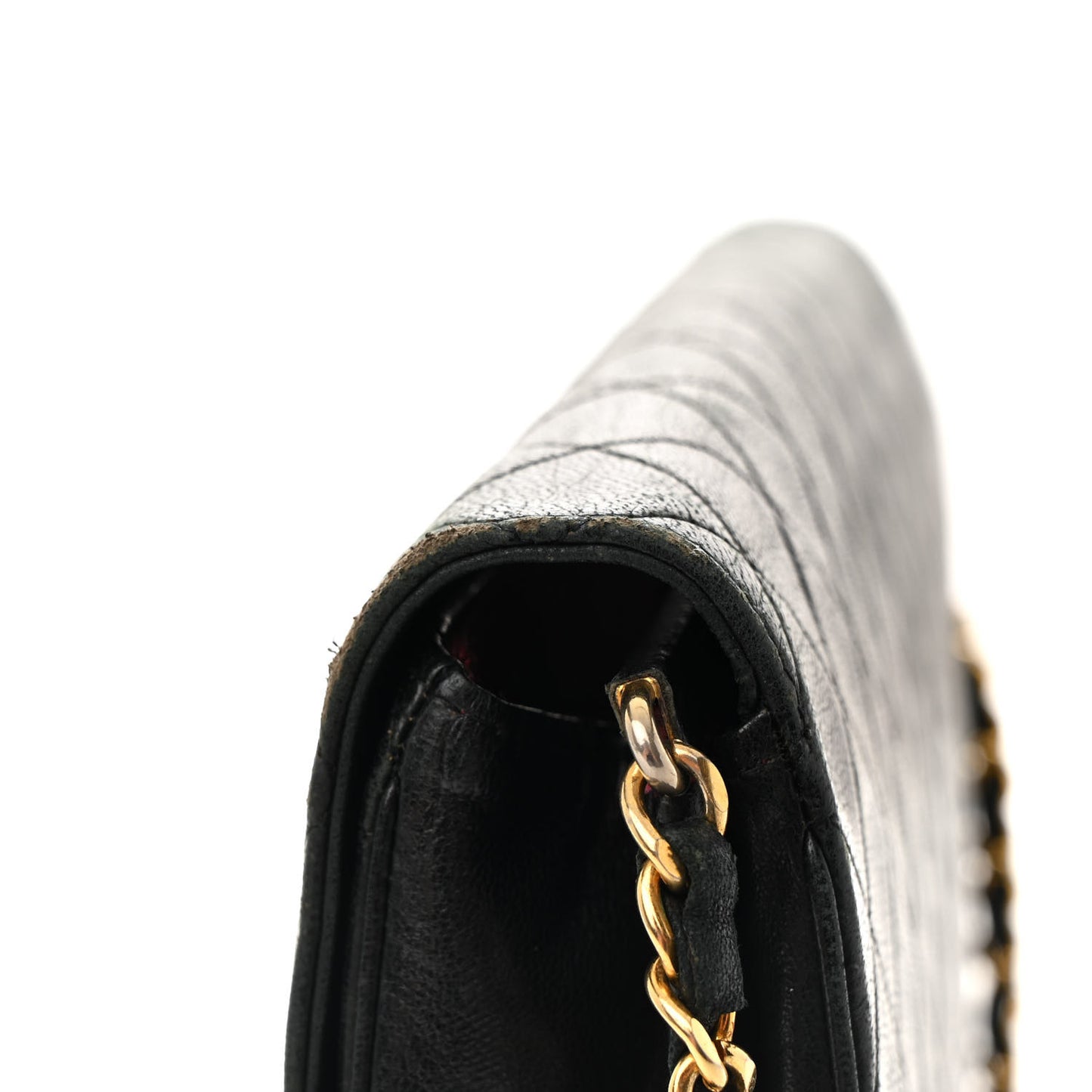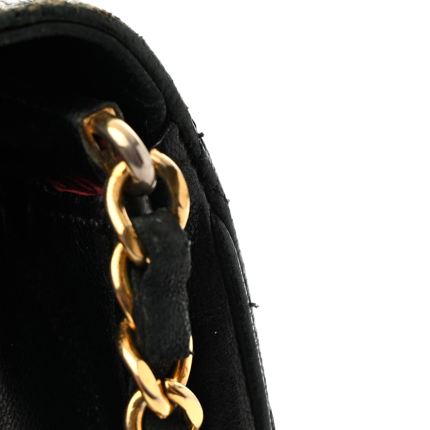 This is an authentic CHANEL Lambskin Quilted Medium Single Flap in Black. This stylish vintage Diana model is finely composed of supple diamond quilted lambskin leather in black. The bag features a polished gold chain link leather threaded shoulder strap and a gold plated Chanel CC logo on the front of the flap. The flap opens to a burgundy leather interior with a zipper compartment and patch pockets.Follow this item for alerts. Chanel is a registered trademark of Chanel. FASHIONPHILE is not affiliated with Chanel.