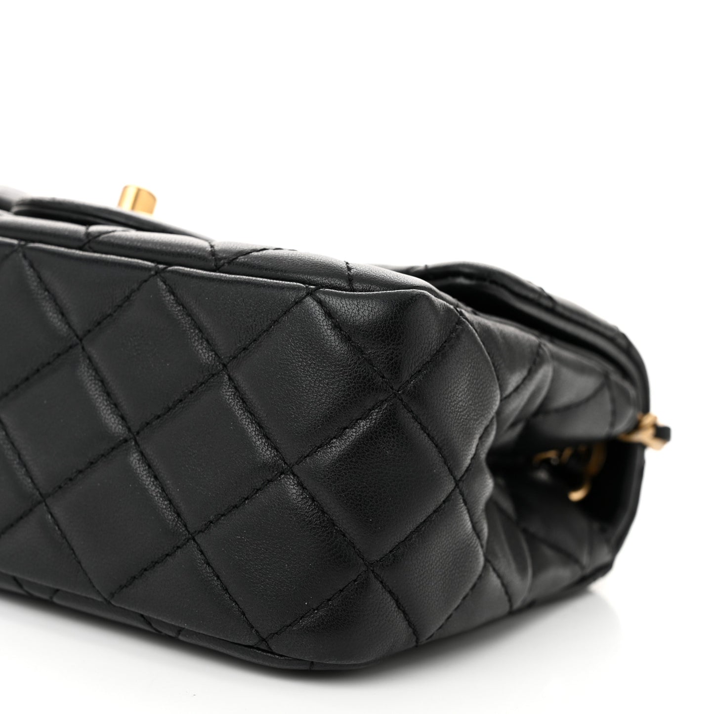 This is an authentic CHANEL Lambskin Quilted CC Pearl Crush Mini Flap in Black. The chic mini crossbody classic is crafted in soft quilted lambskin leather in black. The bag features an aged gold chain link leather threaded shoulder strap and a facing classic aged gold CC turn lock. This opens the flap to a gold leather interior with zipper and patch pockets.Follow this item for alerts. Chanel is a registered trademark of Chanel. FASHIONPHILE is not affiliated with Chanel.