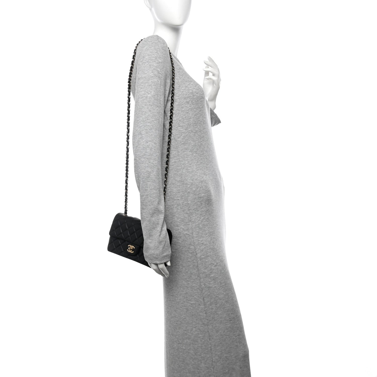 This is an authentic CHANEL Lambskin Quilted Mini Rectangular Flap in Black. The mini crossbody is crafted of diamond quilted lambskin leather in black. The bag features a rear slip pocket, a gold chainlink leather threaded shoulder strap, and a gold classic CC turn-lock on the front. This opens the flap to a black leather interior with zipper and patch pockets.Follow this item for alerts. Chanel is a registered trademark of Chanel. FASHIONPHILE is not affiliated with Chanel.