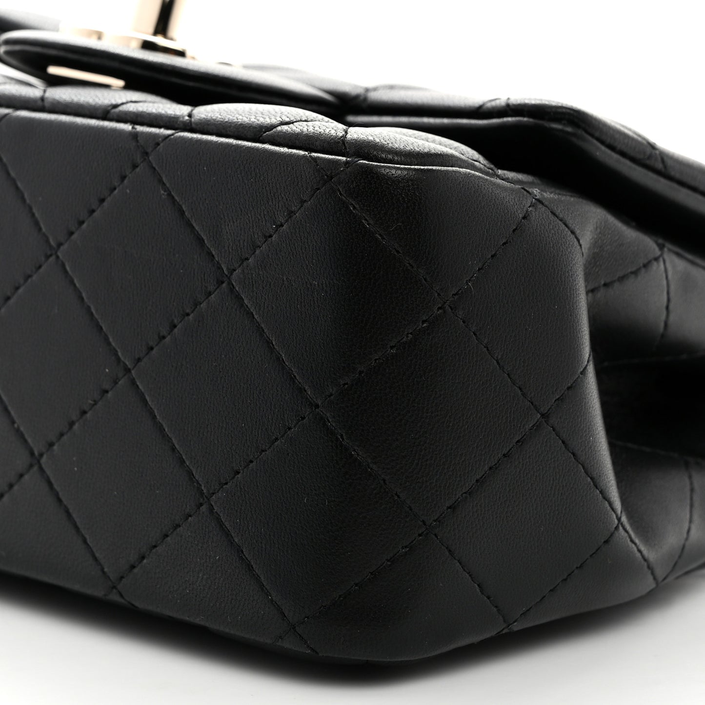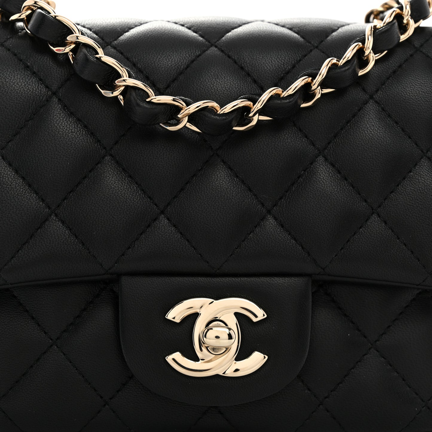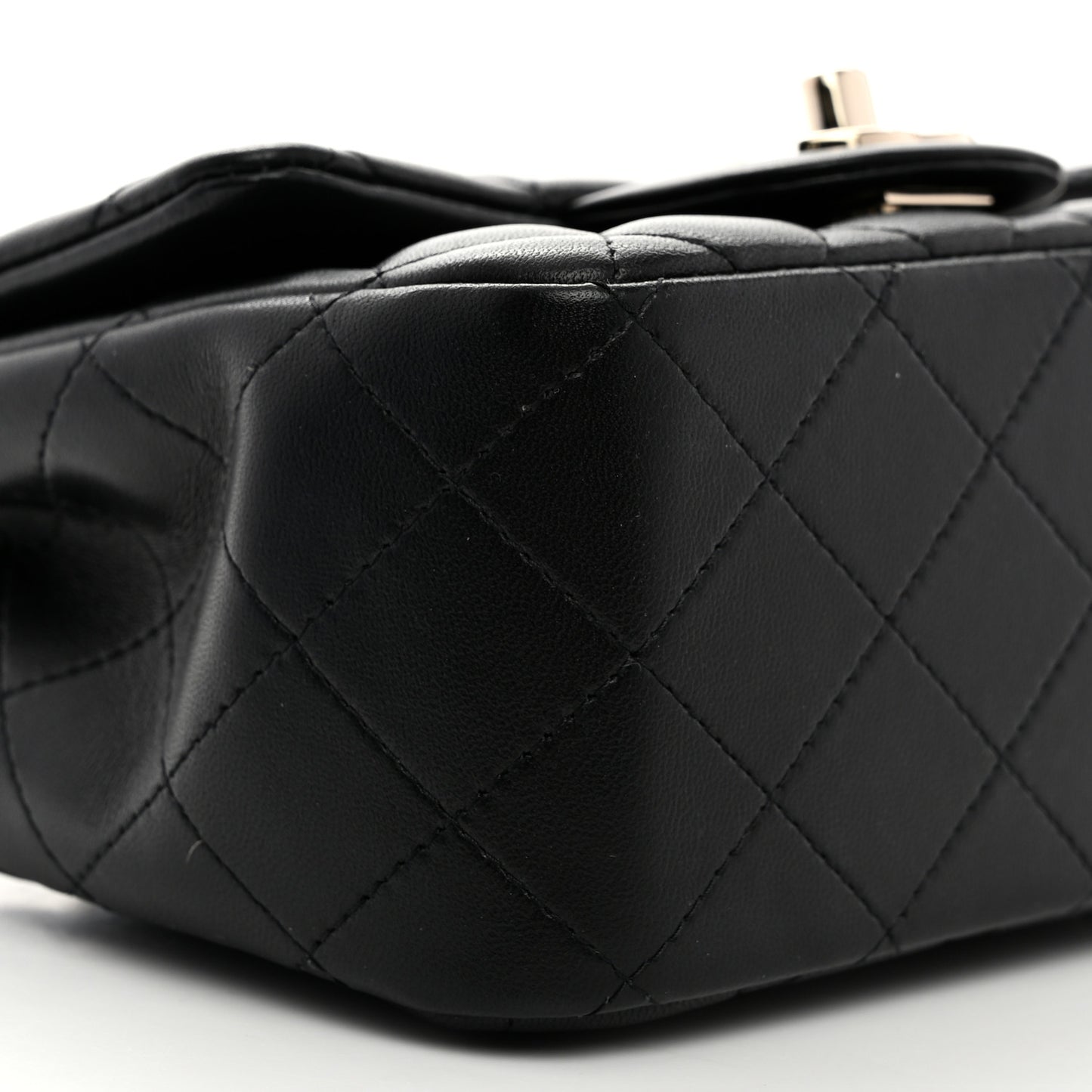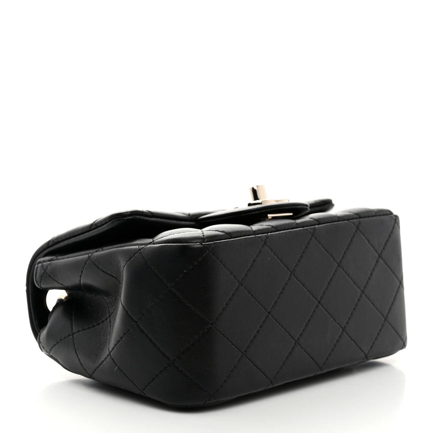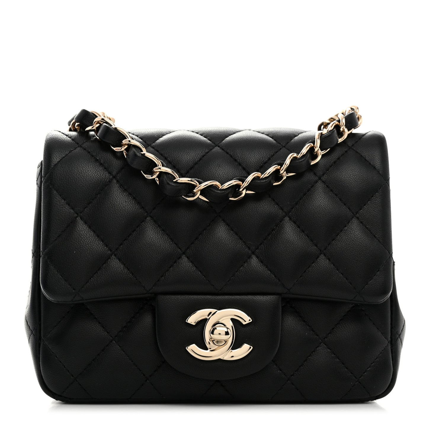 This is an authentic CHANEL Lambskin Quilted Mini Square Flap in Black. This classic bag is finely composed of luxurious diamond quilted lambskin leather in black. The bag features a waist-length polished gold chain link leather threaded shoulder strap and a polished gold Chanel CC turn lock. This opens the front flap to a black leather interior with zipper and patch pockets.Follow this item for alerts. Chanel is a registered trademark of Chanel. FASHIONPHILE is not affiliated with Chanel.